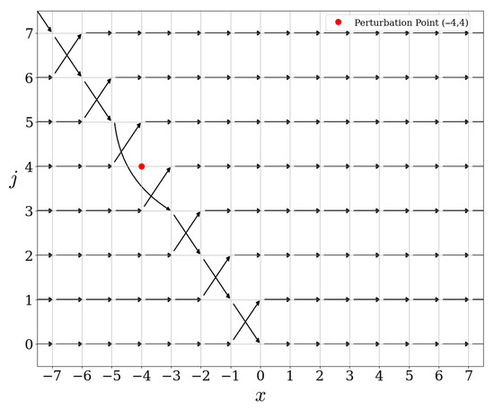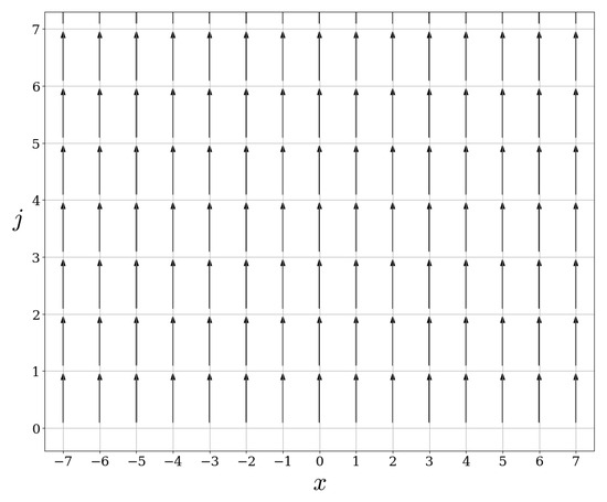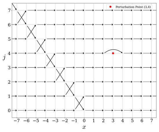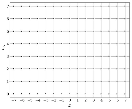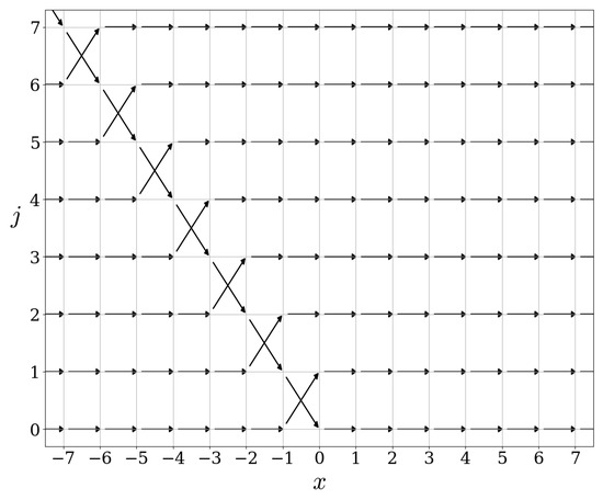 Let us now illustrate the commutation relation of the scattering operators with the free evolution . This commutation relation is visible in the figures. Indeed, the action of on is independent of , for , see Figure 5, Figure 9 and Figure 13. Since the action of is precisely a shift on the x-variable, the commutation relation holds automatically. In fact, any operator commuting with must have an action on which is independent of x.