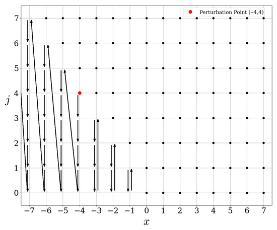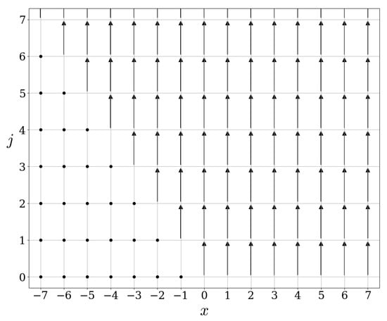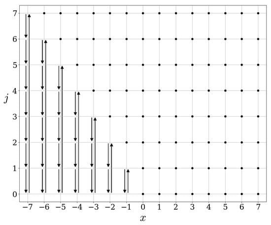 Let us explain how to read the figures provided in this paper: each point on the lattice can be associated to an element of the basis introduced in (2). If A corresponds to the operator represented in a figure, then an arrow starting at and ending at means . A black dot at means that , or in other words the operator A acts as the identity on the element of the basis of .