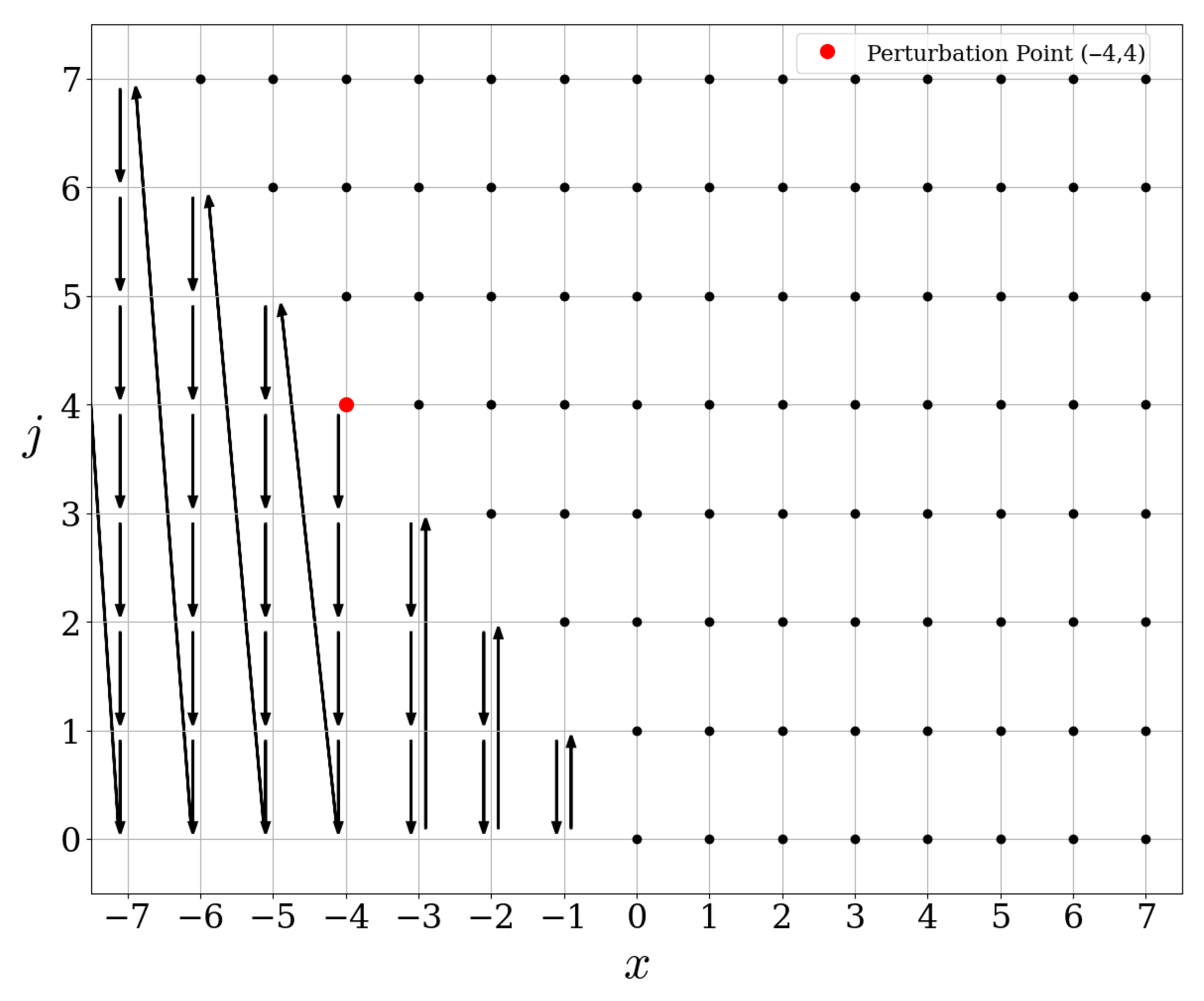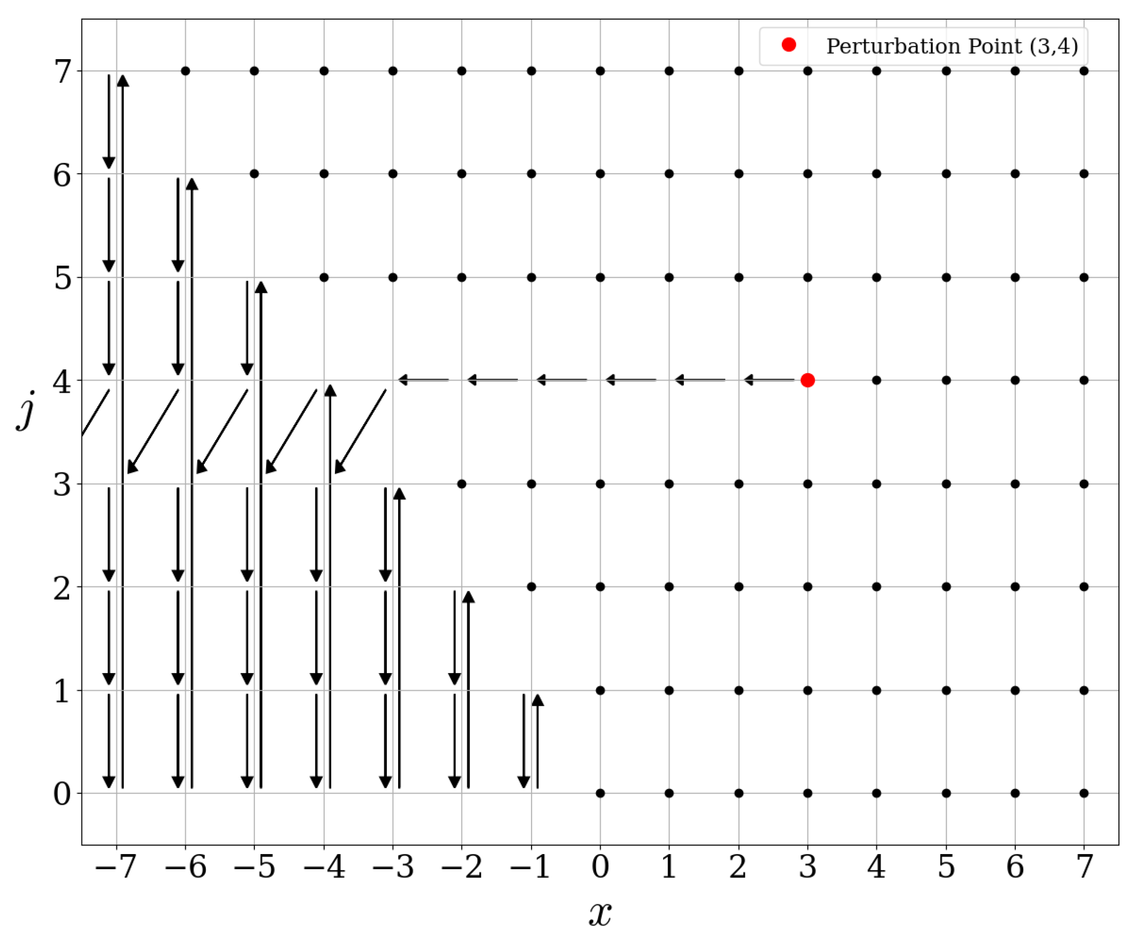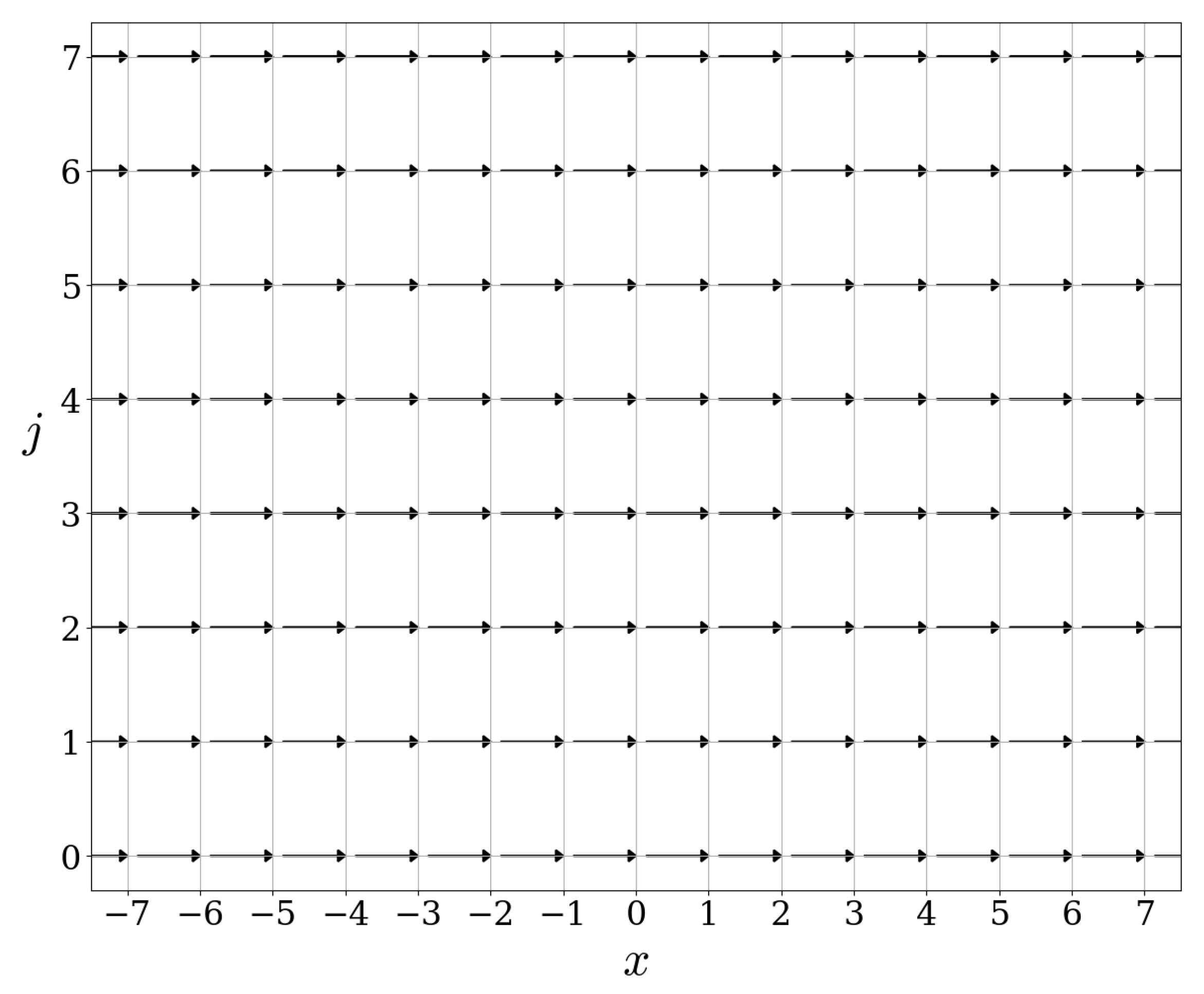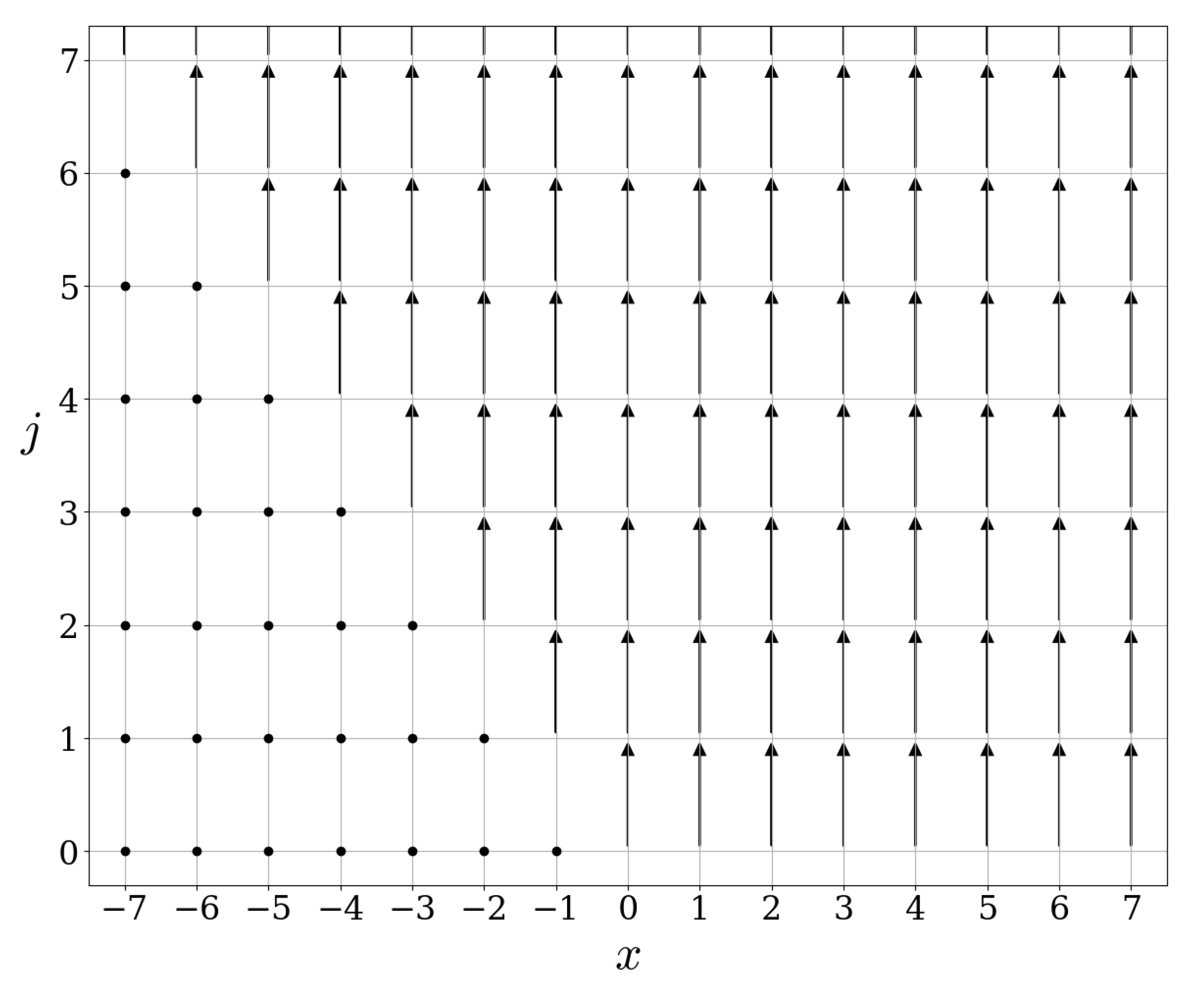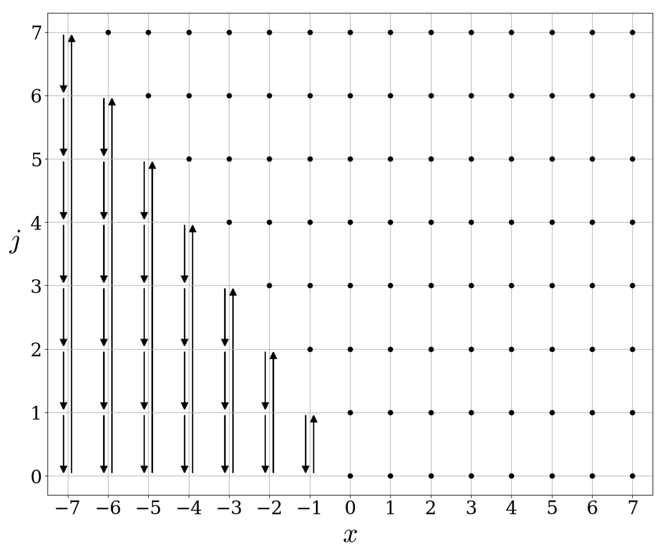 Remark 1. Let us explain how to read the figures provided in this paper: each point on the lattice can be associated to an element of the basis introduced in (2). If A corresponds to the operator represented in a figure, then an arrow starting at and ending at means . A black dot at means that , or in other words the operator A acts as the identity on the element of the basis of . By using the scalar product on