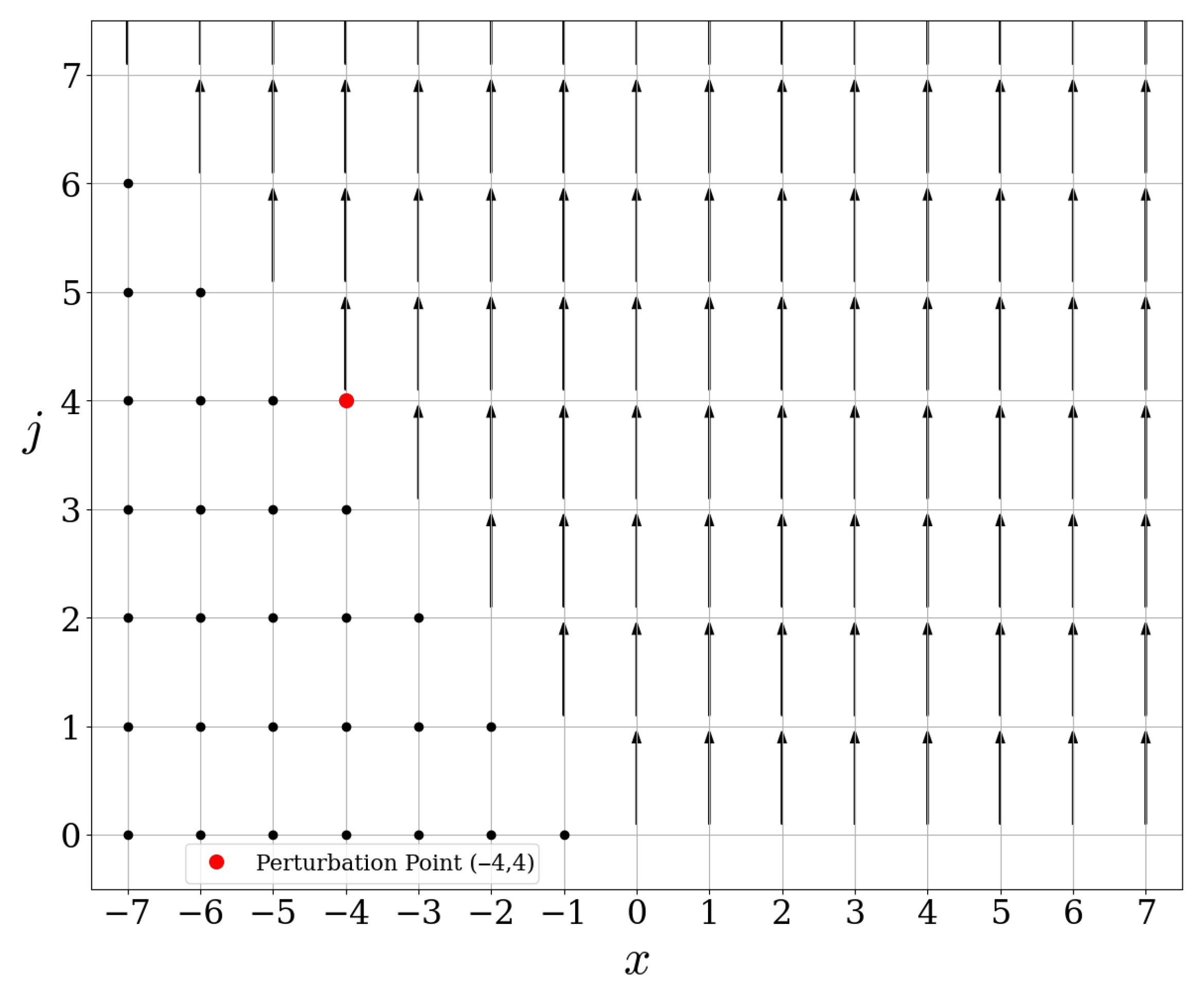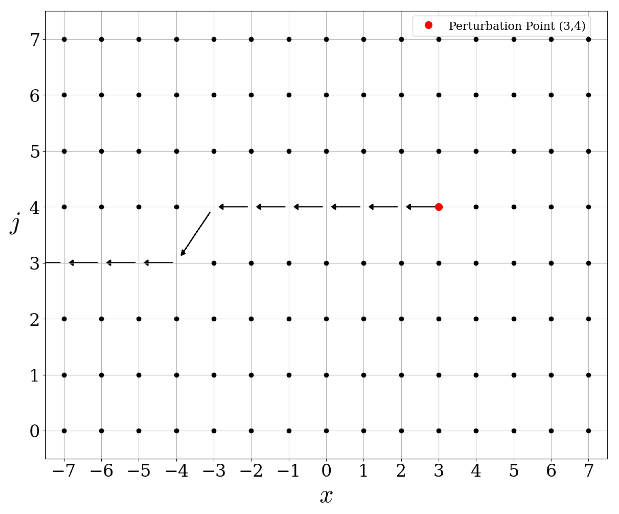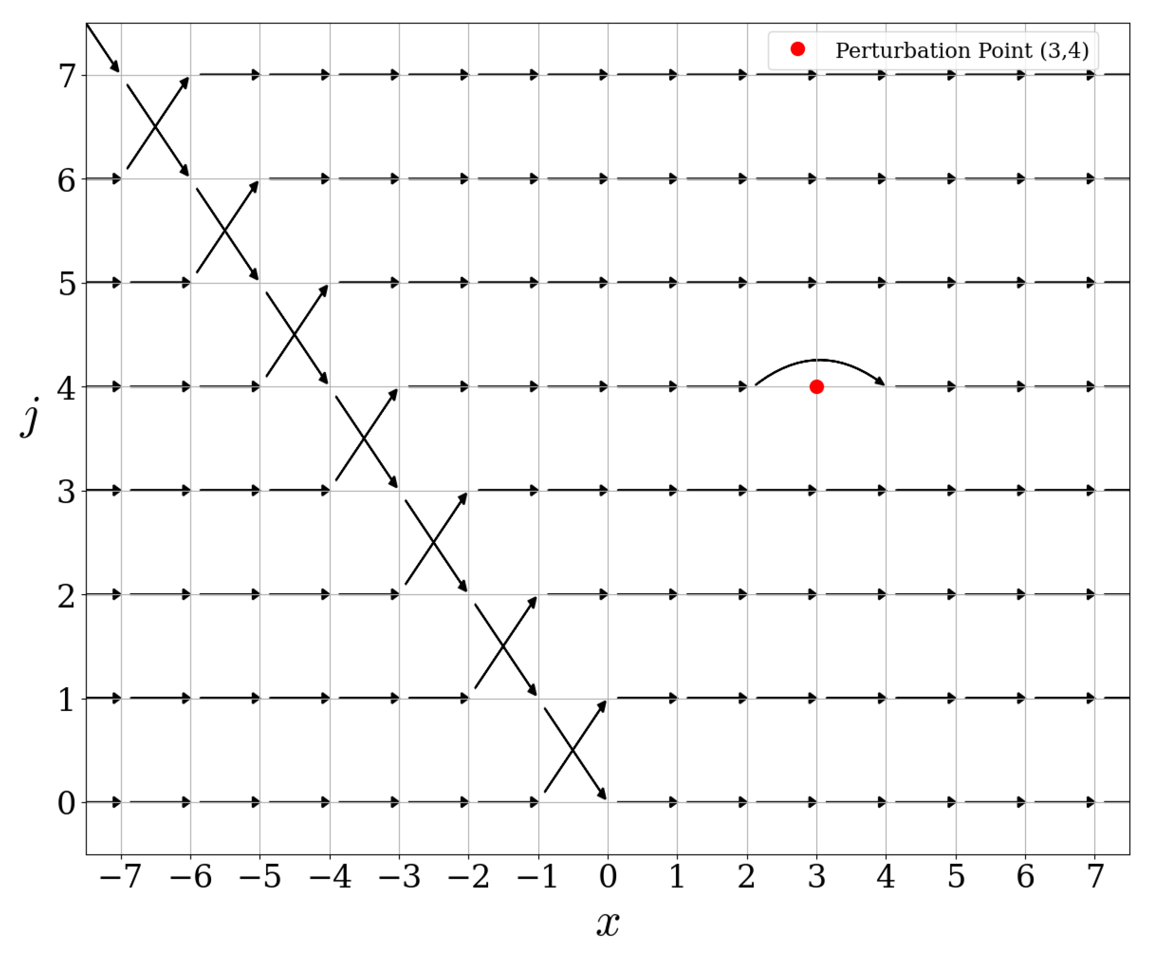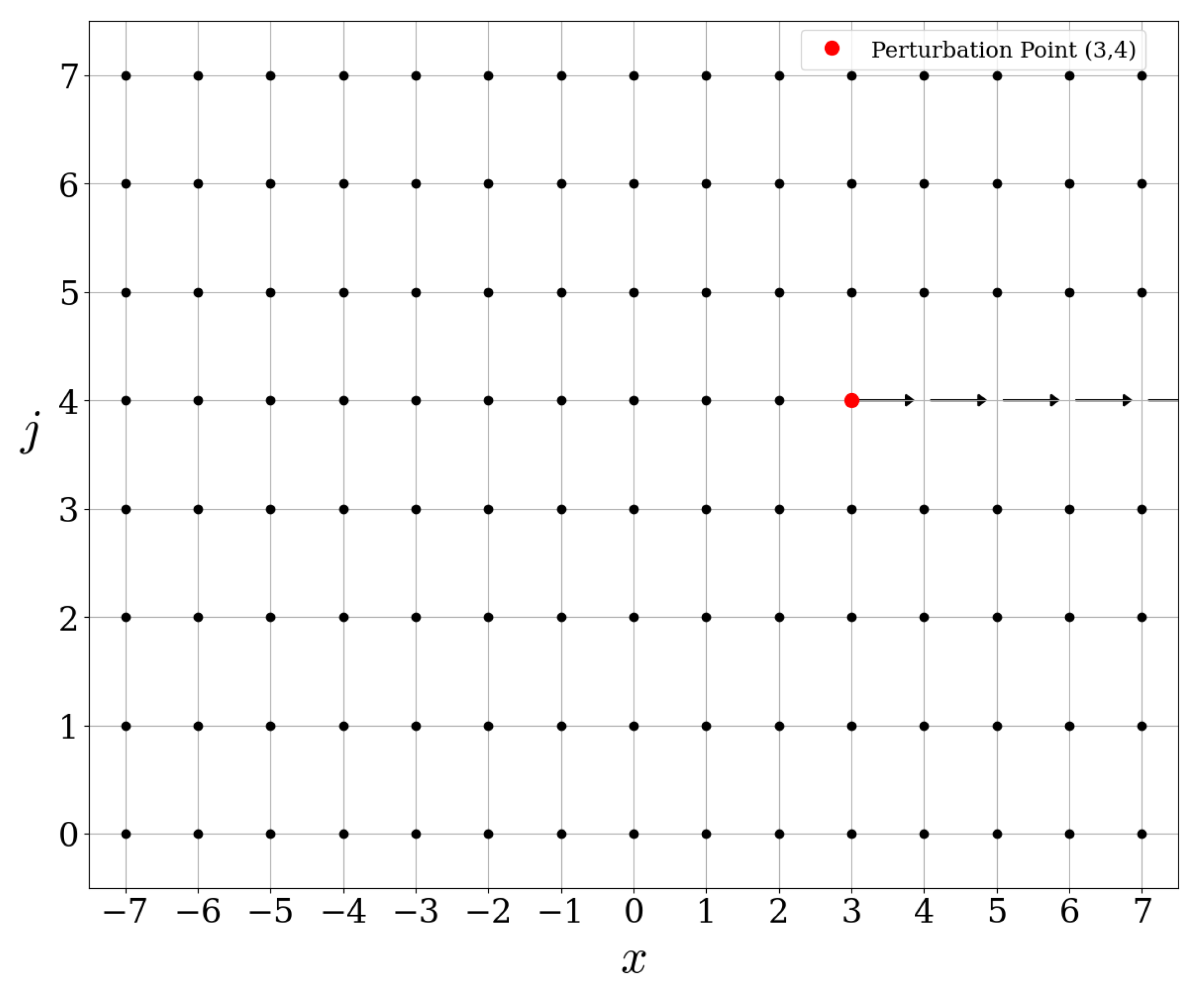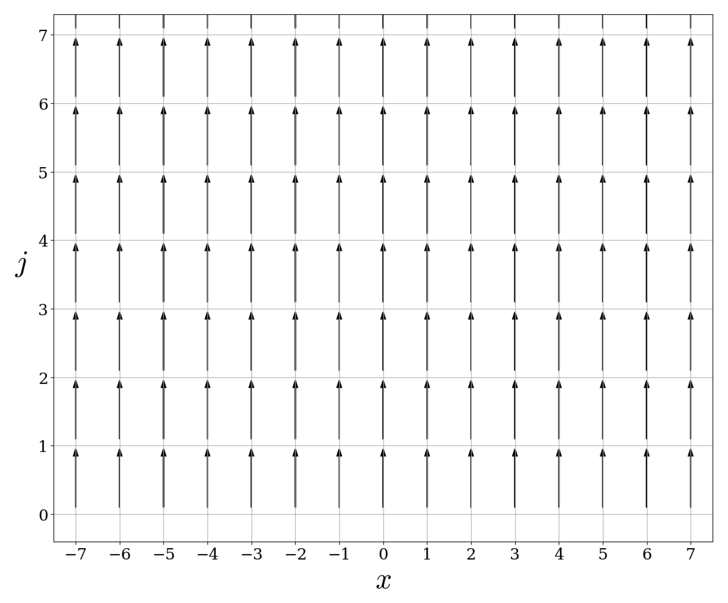Remark 1. Let us explain how to read the figures provided in this paper: each point on the lattice can be associated to an element of the basis introduced in (2). If A corresponds to the operator represented in a figure, then an arrow starting at and ending at means . A black dot at means that , or in other words the operator A acts as the identity on the element of the basis of . By using the scalar product on