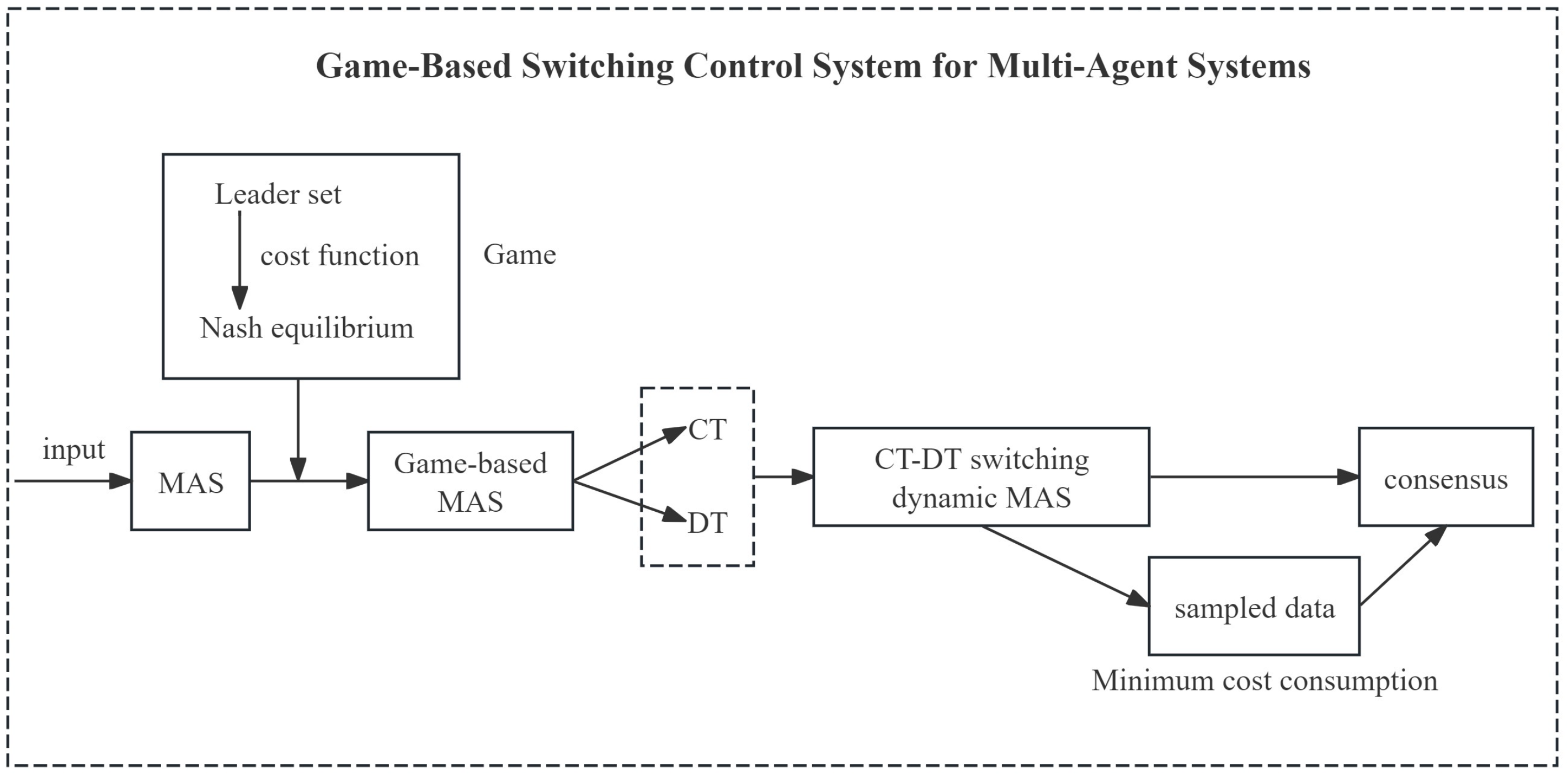 To provide a clearer and more intuitive overview of the proposed control system architecture, a block diagram illustrating the interaction among the game-based decision-making module, the unified sampled-data controller, and the switching multi-agent system is presented in