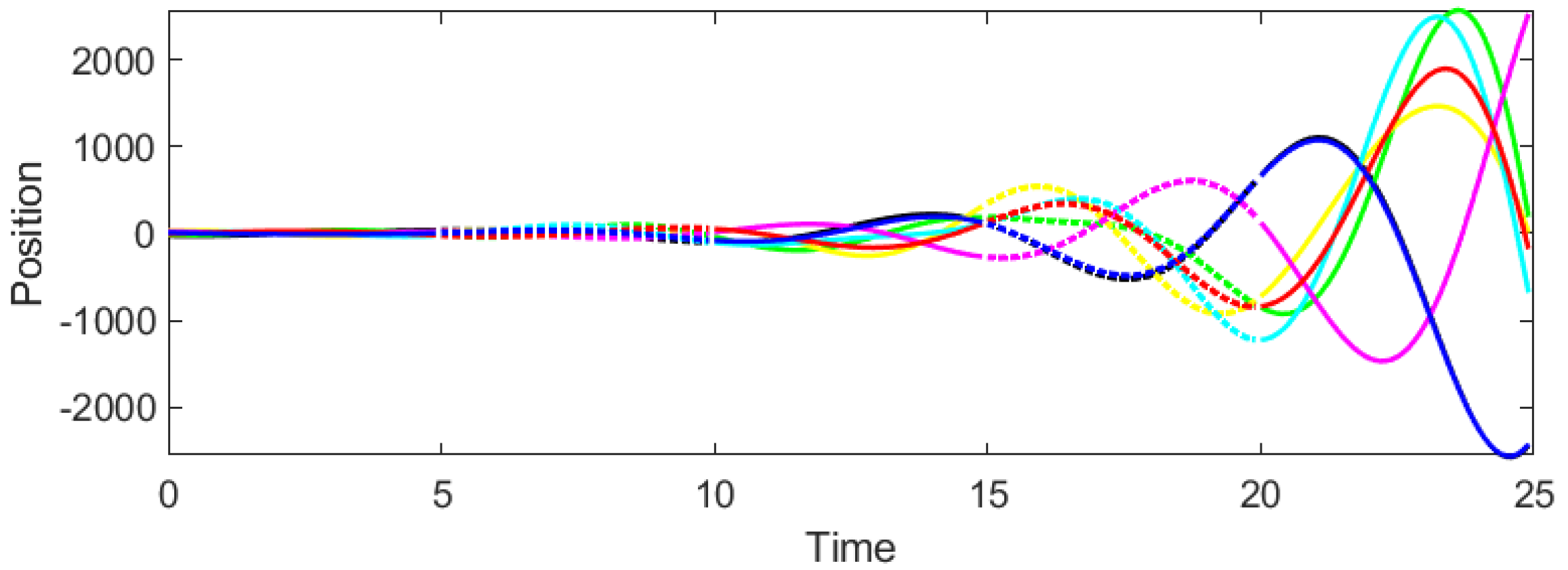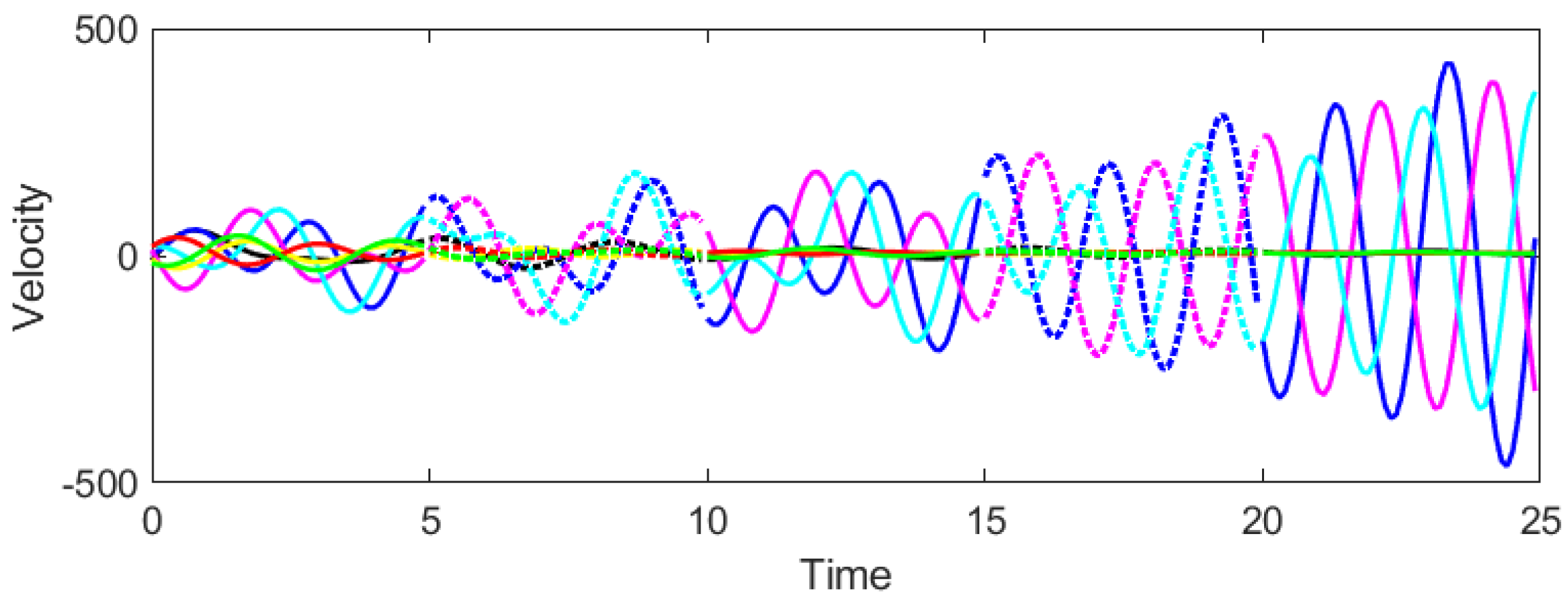 Example 1. Consider the CT-DT switching system (1)–(4) under protocol (31) and stochastic switching, with . According to Theorem 2, the admissible interval of β is derived as . Then we select and to test whether consensus could be achieved. It can be seen from Figure 3 and Figure 4 that when , the system cannot reach consensus. Instead, when , Figure 5 and Figure 6 signify that the system achieves consensus, which verifies the precision of Theorem 2. As shown in