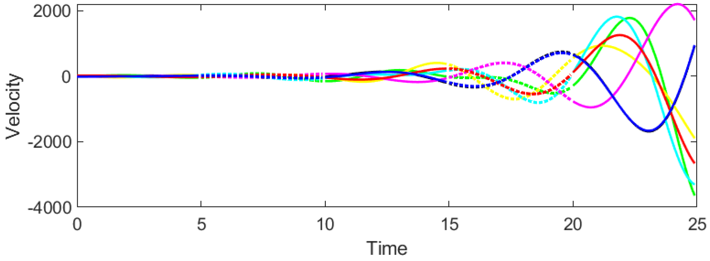 , The initial position vector and velocity vector are intentionally set to be dispersed in both magnitude and direction. This setup ensures that the system starts from a challenging configuration, thereby effectively demonstrating the convergence capability of the control protocols. The following example is completed to verify the correctness of Theorems 2 and 3.
