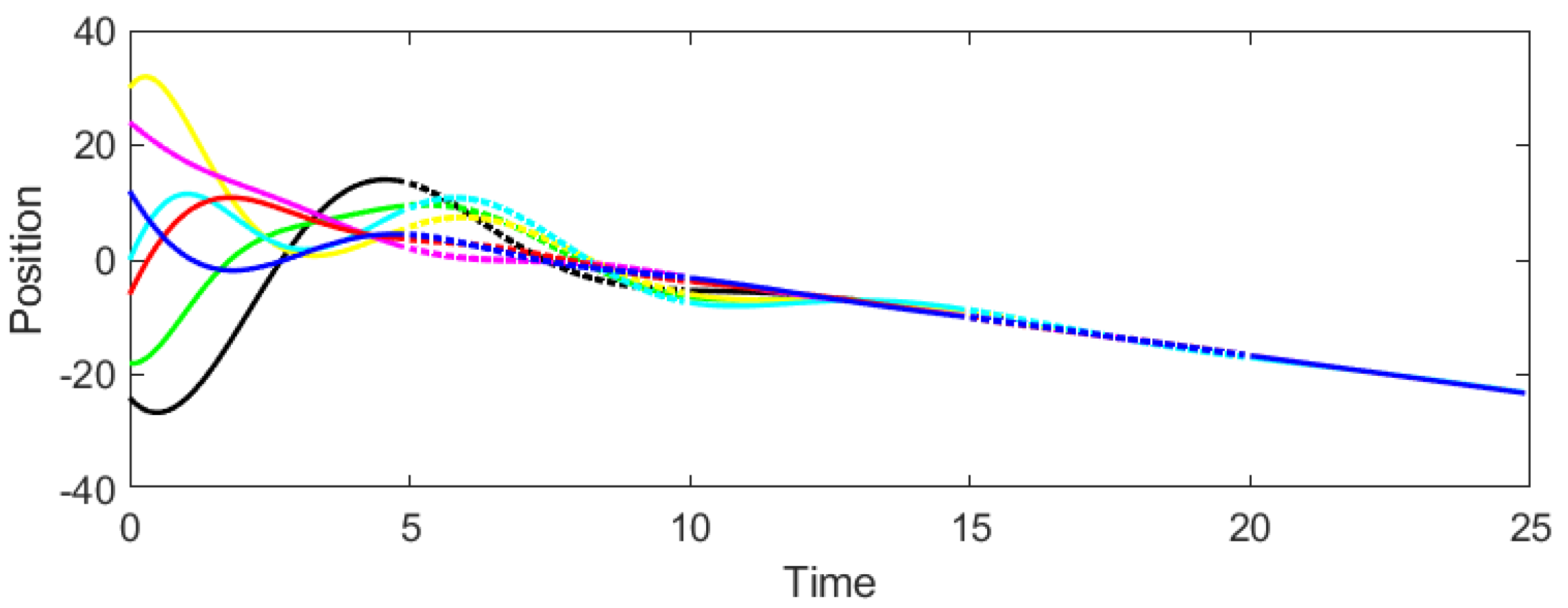 Example 2. Under protocol (34) with stochastic switching, the CT-DT system (1)–(4) is analyzed with the parameter value set to . From Theorem 3, we get the admissible interval β is . Afterwards we set to determine the appropriate range for h with 0 < h < 1.143. We select and . Figure 7 and Figure 8 demonstrate that the system achieves consensus when . In contrast, Figure 9 and Figure 10 show that consensus is not attained when , thereby confirming the validity of Theorem 3. Figure 7 and