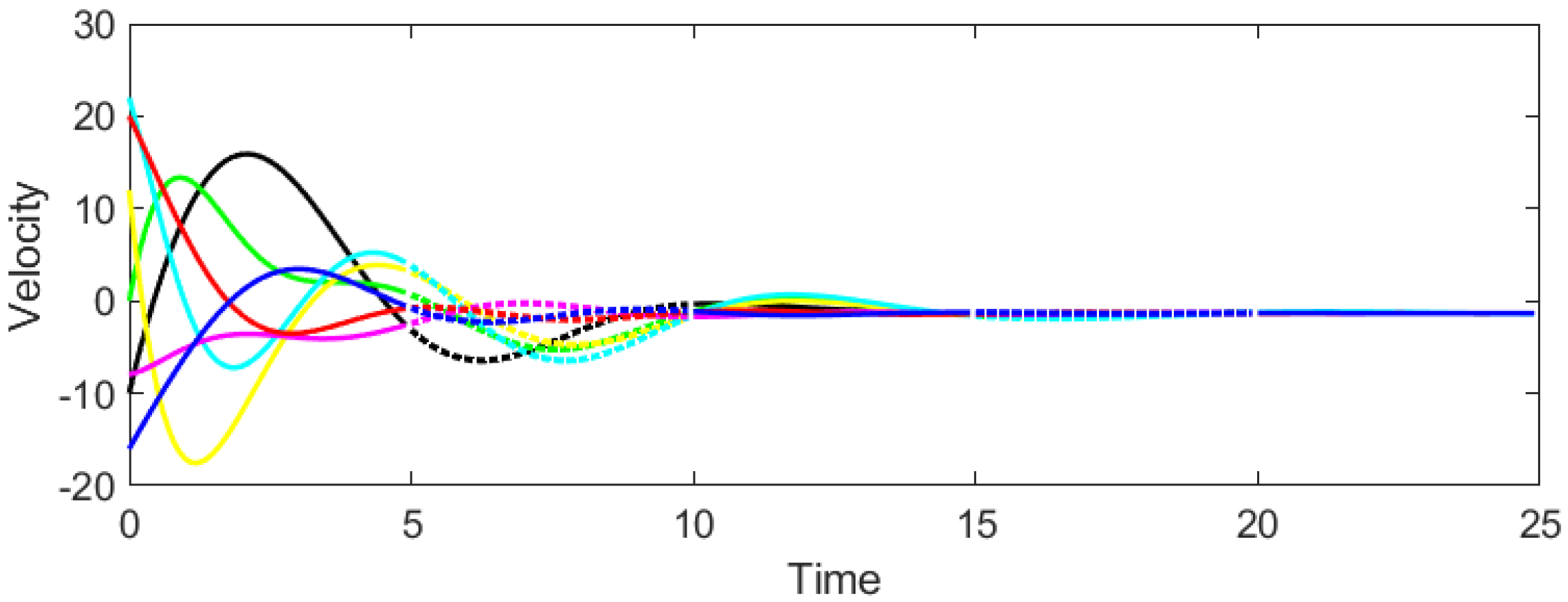 Figure 6 demonstrate that all agents successfully achieve consensus. The position and velocity trajectories converge to common values, confirming the theoretical prediction. The convergence is smooth and occurs within approximately 15 s, illustrating the effectiveness of the proposed game-based control strategy under switching dynamics.