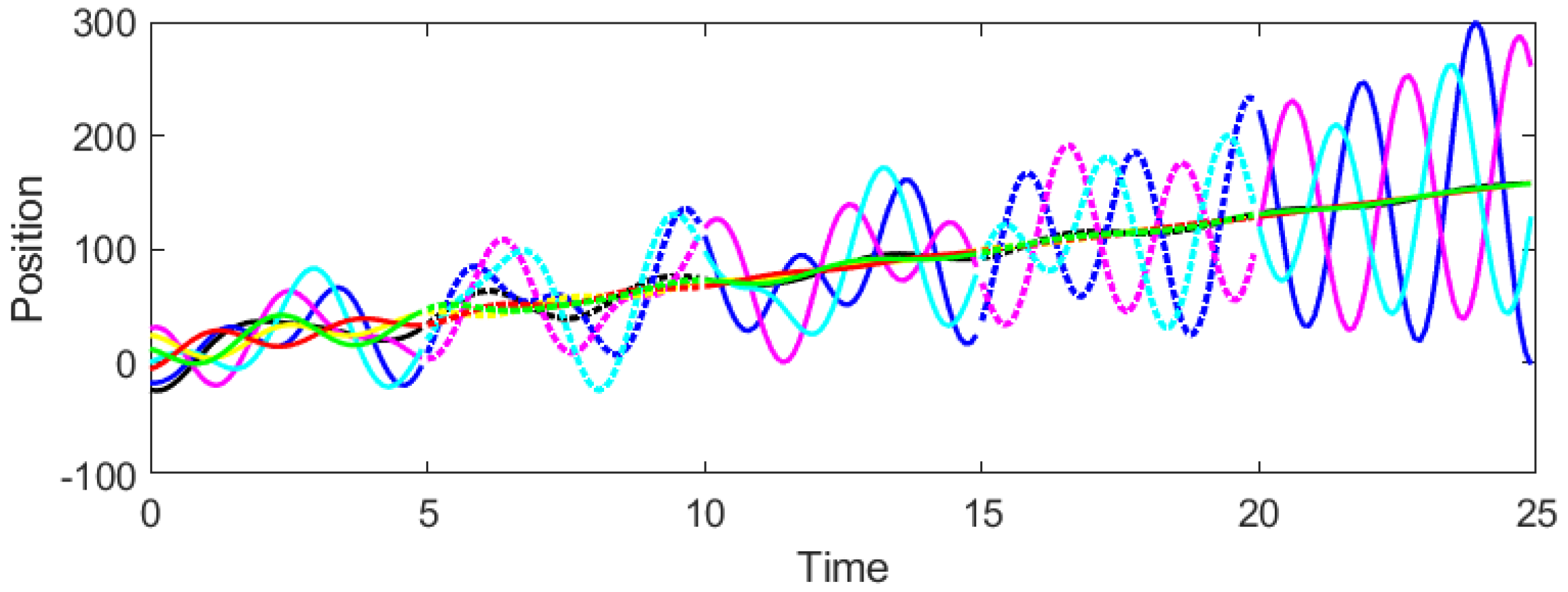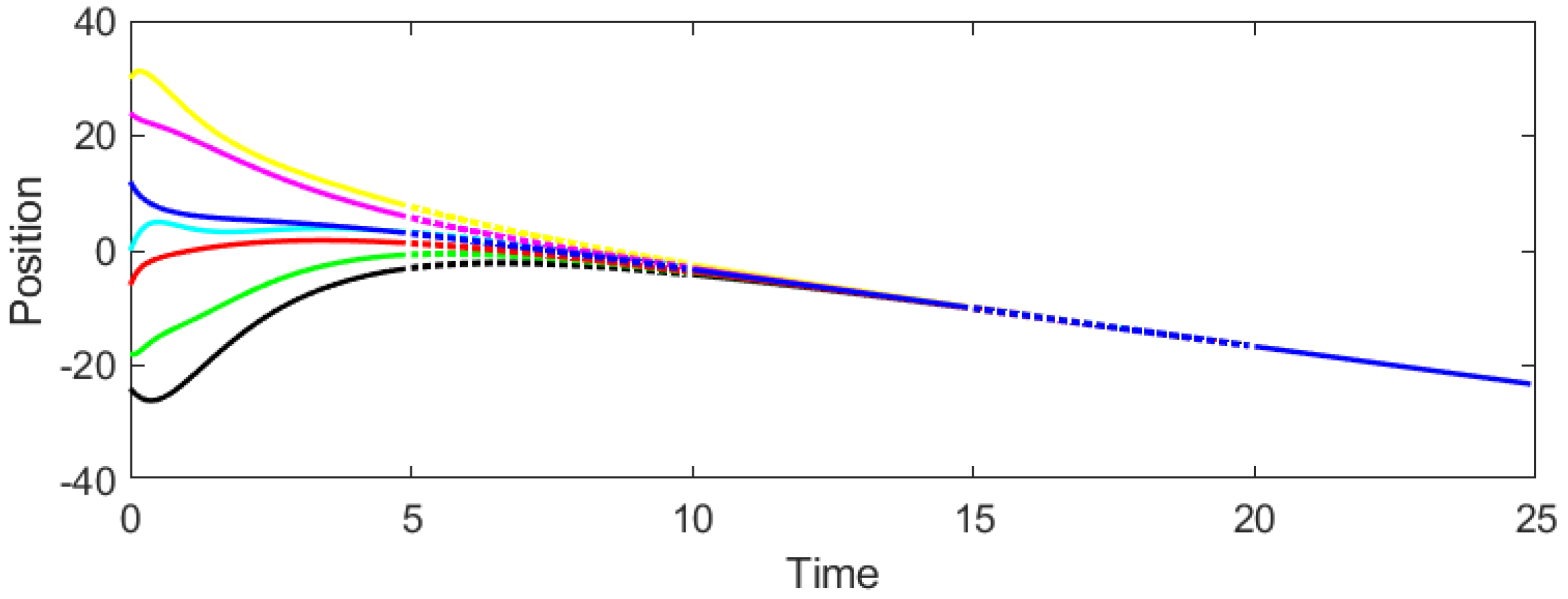 Figure 8 show that the system achieves consensus. The trajectories converge steadily, validating the sampled-data control approach. The smaller sampling period ensures sufficient data updates to maintain stability under switching.