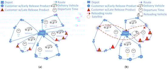 Figure 1 illustrates the operational difference between the traditional VRP and the proposed VRP-RT-RMS. Figure 1a represents the traditional scheme, in which delivery vehicles depart from the depot carrying products available from the beginning of the planning horizon (), referred to as Early Release Products (type-1). To deliver Late Release Products (type-2), which become available only after , vehicles must either wait at the customer location or return to the depot for reloading, thereby increasing both the total distance traveled and the idle time at the depot. Figure 1b shows the proposed en-route reloading approach, where, in addition to the delivery routes, a reloading route (dashed line) is incorporated. This reloading vehicle departs only when , carrying type-2 products, and coordinates with delivery vehicles at selected mobile satellites, which coincide with customer nodes. At these points, a transfer (cross-docking) operation is carried out under synchronized timing, allowing delivery vehicles to continue their routes without returning to the depot. The comparison between both schemes clearly demonstrates that the proposed VRP-RT-RMS model achieves a significant reduction in total distance traveled and idle time, thereby improving operational efficiency and fleet utilization—particularly in scenarios with a high proportion of late-release products.