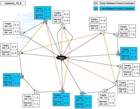 Figure 4. Solution for instance_15_1.Figure 5 presents the model behavior for instance 15_6. The reload vehicle tour according to the table is [0, 3, 1, 5, 14, 12, 2, 0]. In this solution, the same delivery vehicle is reloaded twice along its route, but not at consecutive nodes. This occurs on route [0, 5, 13, 7, 12, 0]: the reloads take place at nodes 5 and 12, with two intermediate visits (13 and 7). This pattern is consistent with the delivery vehicle capacity () and with the cumulative demand and product mix, which require reloading at different points of the tour. The reload vehicle serves multiple delivery routes; between the two reloads of the same route (at 5 and 12), it reloads another vehicle at node 14 before returning to complete the second reload.