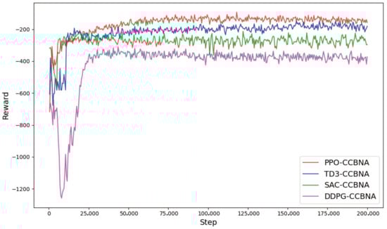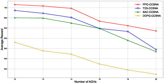 Figure 9 illustrates the impact of the number of AGVs on the average reward. As the number of AGVs increases, the average reward gradually decreases, indicating that higher AGV density leads to increased communication interference and scheduling complexity. Among all algorithms, the PPO–CCBNA model achieves the highest average reward and shows better stability compared with TD3–CCBNA, SAC–CCBNA, and DDPG–CCBNA.