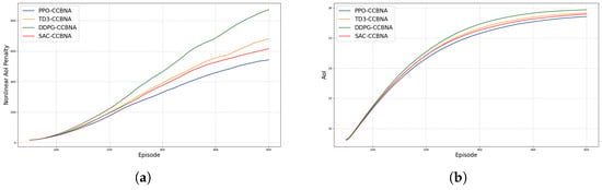 Figure 7a and Figure 7b show the nonlinear AoI penalty and AoI change curves based on different algorithms, respectively, and the PPO-CCBNA algorithm performs well in reducing AoI. Its excellent performance is mainly due to the introduction of the nonlinear AoI-aware mechanism, which imposes stronger penalties on higher AoI values, thus motivating the intelligences to be more active in data communication tasks and update information in a timely manner. Through this mechanism, PPO-CCBNA is able to effectively reduce the overall AoI value, ensuring the freshness of information and communication efficiency.