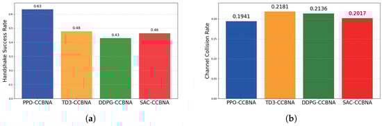 Figure 8a presents the handshake success index across various algorithms, while Figure 8b displays the channel conflict index. The handshake success index measures the proportion of successful handshake matches to the total number of attempted matches, whereas the channel conflict index quantifies how often agents select the same communication channel.The PPO-CCBNA algorithm achieves a notably higher handshake success rate compared to other methods. This improvement is mainly due to PPO-CCBNA’s enhanced ability to learn effective communication pairing strategies, particularly in making more precise handshake-related decisions. By integrating a reward signal for successful handshakes during policy optimization, PPO-CCBNA incentivizes agents to optimize their communication behaviors, leading to much greater pairing efficiency. Additionally, PPO-CCBNA demonstrates the lowest channel collision rate among all tested algorithms. This advantage arises from its superior capability to manage spectrum resource allocation among multiple agents through efficient action mapping and policy gradient updates. By fostering collaborative communication strategies and more accurate action selection, PPO-CCBNA significantly reduces communication interference and channel conflicts, resulting in enhanced overall communication efficiency.