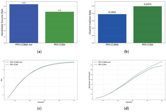 Figure 10a–d illustrate the differences in performance between nonlinear AoI-based optimization and linear AoI-based optimization. The results show that the PPO-CCBNA algorithm, which adopts a nonlinear AoI optimization approach, delivers superior outcomes compared to the linear AoI-based PPO-CCBA algorithm across several core indicators, including handshake success rate, channel collision rate, message freshness, and nonlinear AoI penalty. This performance boost is mainly attributed to the nonlinear AoI mechanism’s ability to impose stronger penalties on high AoI values, which in turn encourages agents to make more proactive and effective communication decisions. As a result, the PPO-CCBNA approach not only achieves higher handshake success rates and reduces channel collisions, but also significantly enhances the freshness of transmitted information throughout the system. Overall, these improvements mean that the proposed method offers clear advantages in terms of information transmission timeliness, stability, and the joint optimization of control and communication processes. In summary, the approach presented in this paper stands out in several key areas—including AoI management, handshake efficiency, channel resource allocation, and control stability—enabling rapid establishment of communication links, reducing overall communication delay, and enhancing the system’s real-time control capabilities.