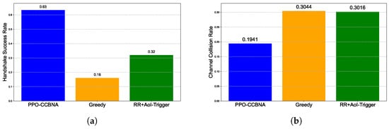 Figure 12 compares the performance of the proposed PPO-CCBNA algorithm with two heuristic approaches: Greedy and RR+AoI-Trigger (Round Robin with AoI Trigger). The results demonstrate the effectiveness of the proposed learning-based approach in optimizing handshake success and reducing channel collisions compared to simpler, non-learning baselines.