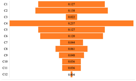 Once normalization is completed, the next step is to compute the weights of the criteria, since ranking procedures generally require weighted data. In this study, the weights are obtained using the DNMEREC method. After normalization, the procedure involves several stages: first, the overall performance of the alternatives is calculated (Equation (3)); then, the effect of each alternative on the criteria is measured (Equation (4)), followed by calculating deviations from the absolute values (Equation (5)). Finally, the criterion weights and adjusted weights are determined (Table 5). The results indicate that criterion C4 recorded the highest weight (w = 0.237), while criterion C12 was assigned the lowest weight (w = 0.004), as detailed in Figure 2.