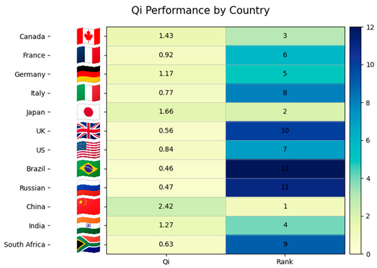 The results of this procedure are shown in Table 6 and Figure 3. The ranking indicates clear disparities in the performance of the observed countries. China emerged as the best-performing alternative with a utility score of 2.417, significantly surpassing other countries. Japan (1.661) and Canada (1.430) followed, forming a strong group of high-ranking performers, driven by their economic strength, technological development, and relatively favorable sustainability indicators. India (1.272) and Germany (1.175) also achieved competitive positions, reflecting moderate success in balancing environmental and economic dimensions.