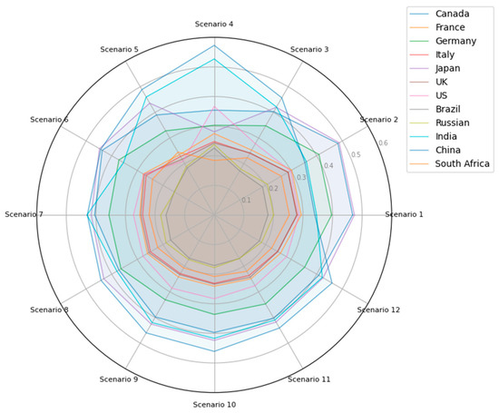 The ranking results carry significant meaning for understanding global development dynamics. The consistent leadership of China and Japan highlights the combined importance of demographic size, industrial output, and human capital in shaping sustainable competitiveness. A closer examination reveals that China’s high ranking, despite its considerable greenhouse gas emissions, is driven by its exceptional economic and structural performance—particularly in GDP growth (C6), exports of goods and services (C9), and gross capital formation (C11). These indicators reflect China’s rapid industrial expansion and investment-driven model, which significantly enhances its sustainability efficiency from an economic perspective. Additionally, China’s large-scale investments in renewable energy, technological infrastructure, and green innovation have partially mitigated the adverse environmental effects of industrialization. Japan’s high ranking, by contrast, is attributed to its robust human capital base (C3), stable labor structure (C2), and macroeconomic consistency (C7–C8), all of which demonstrate institutional maturity and resilience. This contrast underscores two different pathways to achieving sustainability efficiency: growth-driven dynamism in emerging economies and institutional balance in advanced ones. Meanwhile, the recurrent lower positioning of Brazil, Russia, and South Africa underscores systemic economic vulnerabilities and the limited contribution of certain structural indicators to long-term sustainability. The internal reordering of the top countries across different scenarios further illustrates the delicate balance between economic, environmental, and social factors.