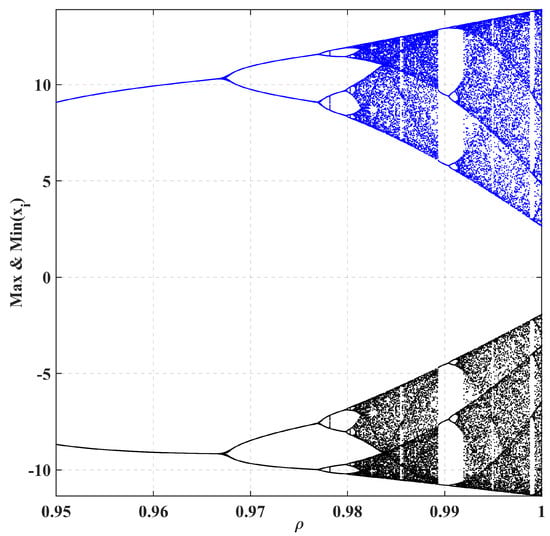 Bifurcation from Figure 1 illustrates how a dynamical system is constructed from stable to chaotic as is raised towards 1. At higher values of , over which there are main period-doubling bifurcations, the resulting chaos filling phase space out to the five-tuple probability distribution with these or equivalent unitary CSS appears as a dense and fractal-patterned region.