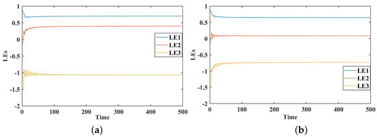 Figure 2 and Figure 3 show the Lyapunov exponents (LEs) for three modes (LE1, LE2, and LE3) at varying values of , , and over time. When goes down, the LE2 and LE3 values tend to become negative, which means that these modes are moving from chaos to stability. On the other hand, LE1 stays positive or close to zero, which means that the behavior is still chaotic or only slightly stable. The results show how small changes in affect stability and chaotic behavior.