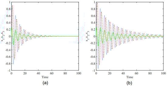 In this section, we investigate the dynamic behavior of a system with parameters and p. Figure 4 gives periodic oscillations; the (b) panel corresponds to and reflects stable limit cycles, while the (a) panel corresponds to and presents the sensitivity according to amplitude and frequency changes. Figure 5 illustrates that the (b) panel equilibrates faster, while the (a) panel exhibits slower damping. The system is simulated with ; the (b) panel corresponds to , while the (a) panel uses . Figure 6 compares different parameter settings, the (b) panel () exhibits higher frequency and amplitude oscillations, whereas the (a) panel () shows lower amplitude oscillations with a simpler pattern.