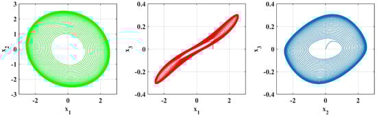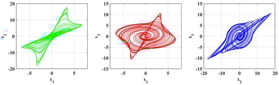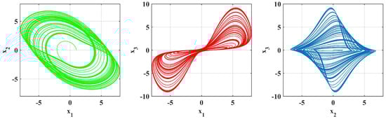 The simulation outcomes presented in Figure 14, Figure 15 and Figure 16 indicate the novelty of the developed system because they illustrate a richness of chaotic attractors obtained by various sets of parameters and . The results shown in Figure 17, Figure 18 and Figure 19 demonstrate new and interesting dynamic phenomena that are caused by the (a) fractional parameters and system coefficients. These results also show the unusual effect of fractional-order derivatives on chaotic growth. For particular preset sets of parameters and orders , the system shows complex attractors, biased trajectories, and regime changes between regular and chaotic motion, which are not seen in standard integer-order systems.
