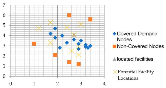 Regarding the coordinates of the facility located at (x = 2.7, y = 4.1), as indicated in Table 5, constructing a single facility will partially meet the demand while leaving other nodes uncovered. Figure 1 illustrates the facility’s location, distinguishing between covered and uncovered demand nodes. It highlights the established facility and identifies potential locations for additional centers.