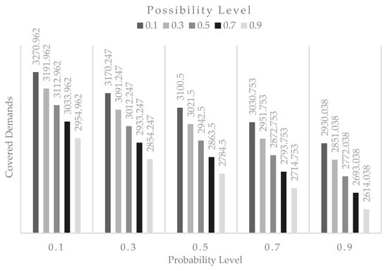 Figure 5 and Figure 6 provide an alternative viewpoint to Table 11 and Table 12, illustrating the optimistic and pessimistic scenarios, respectively. Figure 5 and Figure 6 and Table 11 and Table 12 show the optimal solutions of the problem at different levels of probability and possibility, but the DM can choose a proper level based on his/her circumstances or any other constraints. In both instances, the results clearly indicate that when the probability level remains constant, an increase in the possibility level leads to a decrease in total covered demand. Likewise, when the possibility level remains steady, raising the probability level also results in a reduction in total covered demand.