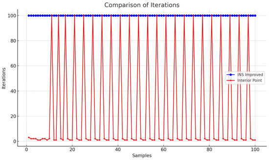 In Figure 2, we compare the number of iterations needed to arrive at the ideal value using the IPM method and the modified INS algorithm, two nonlinear optimization procedures. The number of iterations needed for each sample is shown in the above chart. Based on these data, the modified INS method has an average of 100 iterations, but the IPM approach has an average of 68.11. This difference shows that the improved INS algorithm needs more iterations to reach the optimal value. Variations in the number of iterations between samples reveal that the interior-point algorithm often requires fewer iterations in some cases, suggesting higher efficiency in reducing iteration counts. However, the improved INS algorithm maintains a more consistent number of iterations across all samples, indicating greater stability.