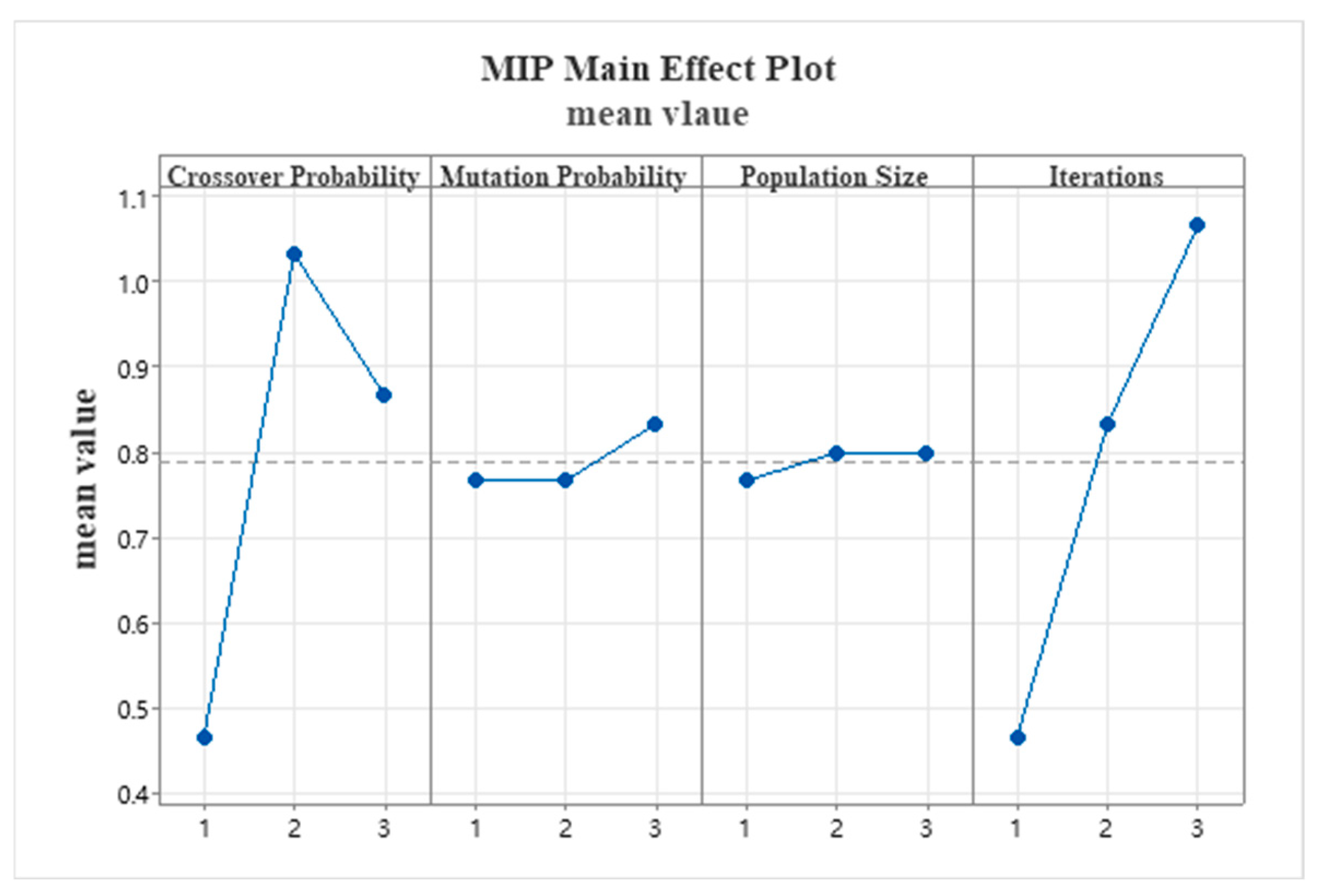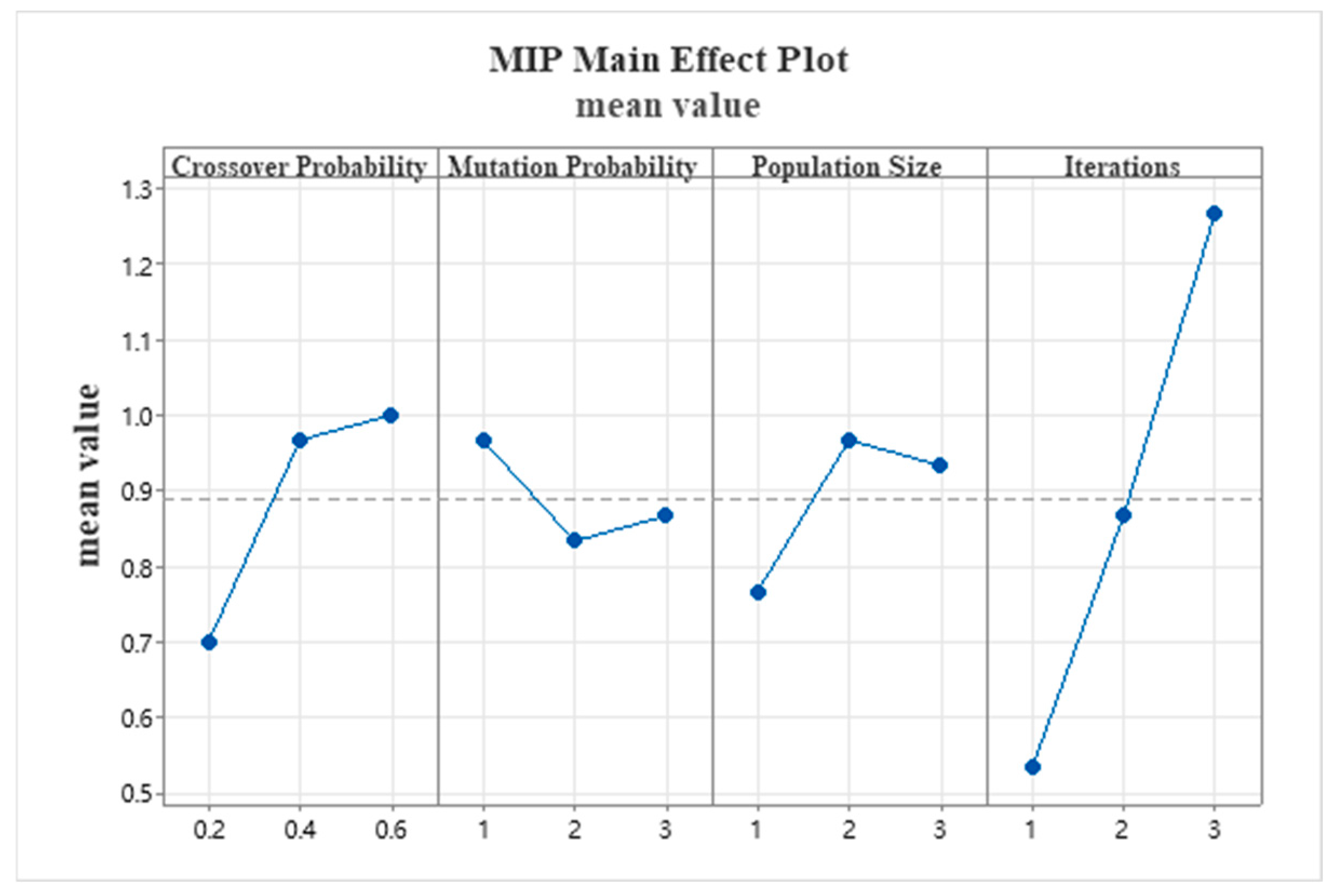 | Crossover Probability | Mutation Probability | Population Size | Iterations | MIR |
