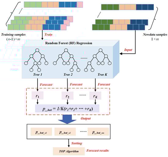 The rule-based meta-model generates selection rules for each candidate algorithm. When the meta-features meet the selection rules, it indicates that the corresponding candidate algorithm is the appropriate one for the task. Ali et al. [] used the rule-based learning algorithm C5.0 to describe which types of algorithms are suited to solving which types of classification problems. Azadeh et al. [] extracted 18 types of dataset meta-features and used Classification and Regression Trees (CART) to select the optimal algorithm from six candidate algorithms. Distance-based meta-models measure the distance between tasks using meta-features. Their basic idea is that algorithms exhibit similar performance on similar tasks, and the similarity between tasks can be quantified and calculated through meta-feature distance. For a new task, the appropriate algorithm for it is predicted by using the applicable algorithms of other tasks that are closest to it in distance. Common distance metrics include Euclidean distance, Manhattan distance, cosine distance, and Jaccard index [,,,]. In addition, some studies map the algorithm selection problem to a regression problem. They train meta-models using task meta-features and the performance metric values of candidate algorithms, input the meta-features of a new task into each meta-model to obtain predicted performance metric values, and output the appropriate algorithm by comparing the predicted performance of each algorithm. Lorena et al. [] used the Support Vector Regression (SVR) algorithm as the meta-model and constructed 28 meta-models respectively for 14 candidate regression algorithms and two types of regression problem meta-features. Diego et al. [] trained meta-models on each meta-dataset using the Linear Regression (LR) algorithm. They predicted the performance metric values of candidate algorithms on new datasets through these meta-models, thereby forming a ranking of the predicted algorithms. Garcia et al. [] employed three regression meta-algorithms including SVR to predict the performance metric values of five candidate classification algorithms. They compared the application effects of different types of meta-features based on the prediction biases. Some scholars have constructed meta-models with strong generalization performance and algorithm selection performance by introducing the idea of ensemble learning. Random forest (RF) is one of the widely used meta-models in meta-learning-based algorithm selection research. Owing to its ability to evaluate feature importance, random forest can clearly identify the impact of dataset meta-features on model selection. It also balances accuracy and interpretability in small-to-medium-sized tasks, thus becoming a benchmark method in numerous studies []. Auto-sklearn, as a representative automated machine learning framework, further optimizes the meta-learning process by integrating Bayesian optimization technology. It constructs a search space covering multiple algorithms and their hyperparameters, and dynamically adjusts the search direction based on historical performance feedback to efficiently screen out the optimal algorithm configuration for a specific dataset. Feurer et al. [] verified through a large number of experiments that Auto-sklearn outperforms manual parameter tuning in standard classification and regression tasks, and its highly encapsulated framework reduces the application threshold for automatic algorithm recommendation.