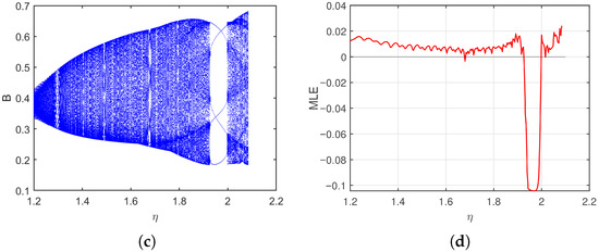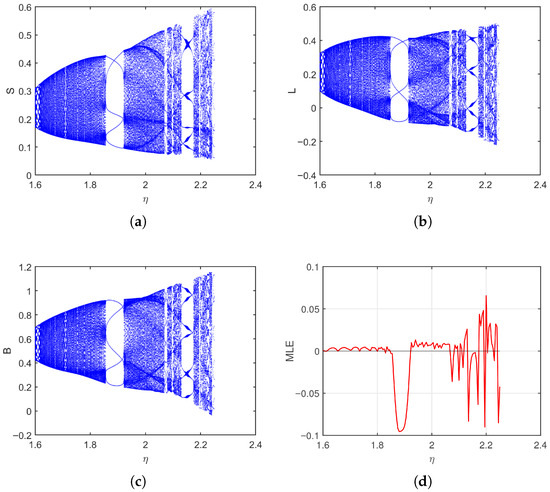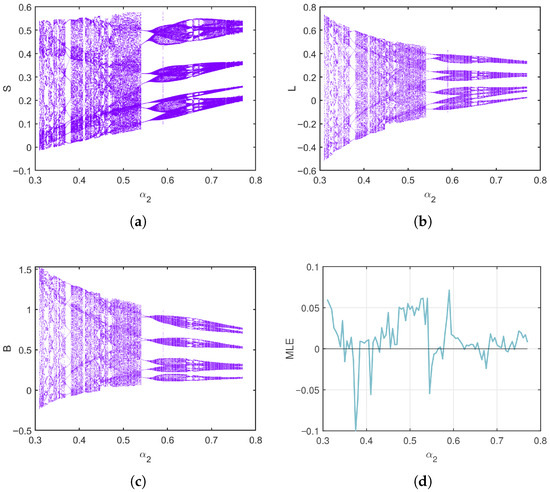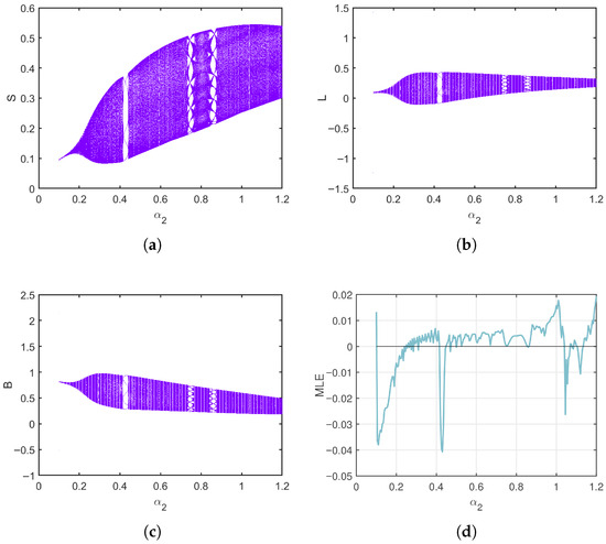 In the first case, start from and take , we analyze how the system responds to variations in the transition rate over the interval . As shown in Figure 2, the bifurcation diagrams for the susceptible (S), latent (L), and breaking-out (B) classes reveal a clear evolution from stable fixed points to increasingly irregular and oscillatory behavior. Initially, all state variables demonstrate regular and periodic patterns. However, as , the rate at which latent computers break out increases, the dynamics grow more complex for S, L, and B, which develops a period-doubling structure leading to chaos. This behavior reflects how a high rate of transition from latency to active infection can destabilize the system and promote widespread outbreaks. The MLE plot (Figure 2d) provides quantitative support for these observations.