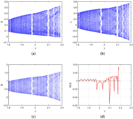 Bifurcation and MLE of the discrete-time SLB model of computer viruses (2) as varies for . (a–c) Bifurcation of S, L, and B, (d) Maximum Lyapunov exponent (MLE).
