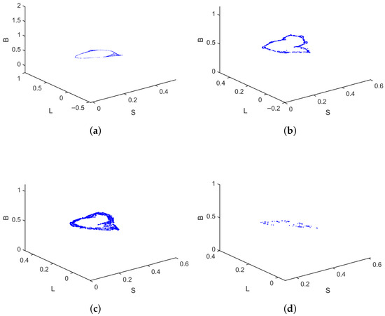 In the second case, a different parameter setting is used , with now ranging from to . The bifurcation diagrams in Figure 6 reveal more abrupt and complex changes compared to the first case. The infected population B displays sudden bifurcations and dense oscillations as increases, and the latent class L exhibits irregular patterns even in the lower half of the range. This suggests that in certain configurations, even moderate increases in the rate of transition from latency to active infection can lead to dramatic destabilization. The MLE plot in Figure 6d shows narrow windows of positive values, indicating short-lived chaotic intervals. This intermittent chaos is often harder to detect but may result in unpredictable outbreaks or sudden bursts in virus activity. From a practical standpoint, this implies that even a brief increase in the infection activation rate can compromise the entire network’s stability. Phase portraits of the system for different values are shown in Figure 7. These portraits confirm the sensitivity of the system to , with trajectories becoming more irregular and fragmented as increases. Fixing and varying from 0.2 to 0.8, the bifurcation diagrams and MLE in Figure 8 reveal even sharper and more discontinuous transitions than in the first case. The breaking-out class B becomes extremely sensitive to the cure rate, with oscillations and chaotic windows appearing frequently. Phase portraits in Figure 9 further illustrate this high sensitivity. The attractors are irregular and fragmented, with less structure and higher density in the phase space. System trajectories show erratic and non-repeating behavior, a hallmark of chaos. This case highlights that under certain parameter combinations, the system becomes far more reactive to small parameter changes, leading to abrupt and significant chaotic behavior.