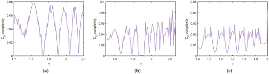 In our simulations, the threshold parameter is selected as r = 1, which is the standard choice used in C0-complexity analysis. Low values of indicate ordered or periodic dynamics, while higher values reveal chaotic and irregular behaviors, making it a reliable tool for complexity assessment in discrete-time systems. The complexity of the discrete-time SLB model was evaluated by varying while fixing at different values with . As shown in Figure 14, increasing from to leads to more pronounced irregular fluctuations in , which indicates a higher sensitivity of the system to initial conditions. These results demonstrate that the cure rate plays a significant role in the transition to chaos, and higher values intensify the system’s complexity, in agreement with the bifurcation and phase portrait analyses.