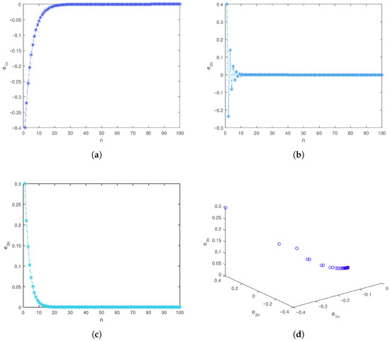 Computation shows that the eigenvalues are , , and . Based on the assumption in Proposition 2, the eigenvalues satisfy , . This guarantees that all eigenvalues lie strictly within the unit circle; it can be shown that the error system is globally asymptotically stable. Thus, synchronization between the master and slave systems is ensured. □