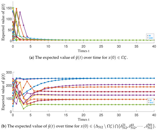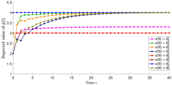 Figure 1 shows the expected value of over time from every initial state. Crucially, the figure includes comparative cases: when the initial state lies inside , the expected value of asymptotically converges to the target value of 4; conversely, when the initial state is outside (e.g., or ), the expected value of fails to converge to 4. This figure confirms, from the perspective of statistical expectation, that the computed accurately delineates the set of initial states from which asymptotic output tracking can or cannot be achieved.
