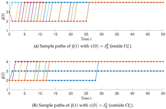 Figure 2 provides validation from the perspective of sample paths by explicitly comparing output trajectories from two specific initial states: (inside ) and (outside ). Subfigure (a) demonstrates that all sample paths of , under the initial condition , successfully converge to 4. In contrast, Subfigure (b) shows that, with the initial state , some paths of converge to 4 while others settle at 3. Together, these figures robustly support the effectiveness of the proposed method for computing the maximum TROA and the corresponding controller design strategy.