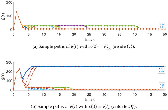 Figure 4 validates the TROA boundary through sample paths of under two distinct initial conditions. Subfigure (a) shows sample paths of originating from the initial state within , all of which converge to the target value of 3, confirming effective tracking. Subfigure (b) presents sample paths of from the initial state outside , where trajectories probabilistically diverge, with some reaching the target value of 3 and others converging to 254. This behavior confirms that asymptotic tracking cannot be guaranteed for initial states outside the maximum TROA.