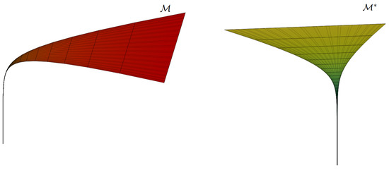 Consider the catenoid hypersurface given with the parametrization (20) and the parallel hypersurface of given with the parametrization (22), respectively (Figure 4). For , parallel hypersurface of has the following parameterization