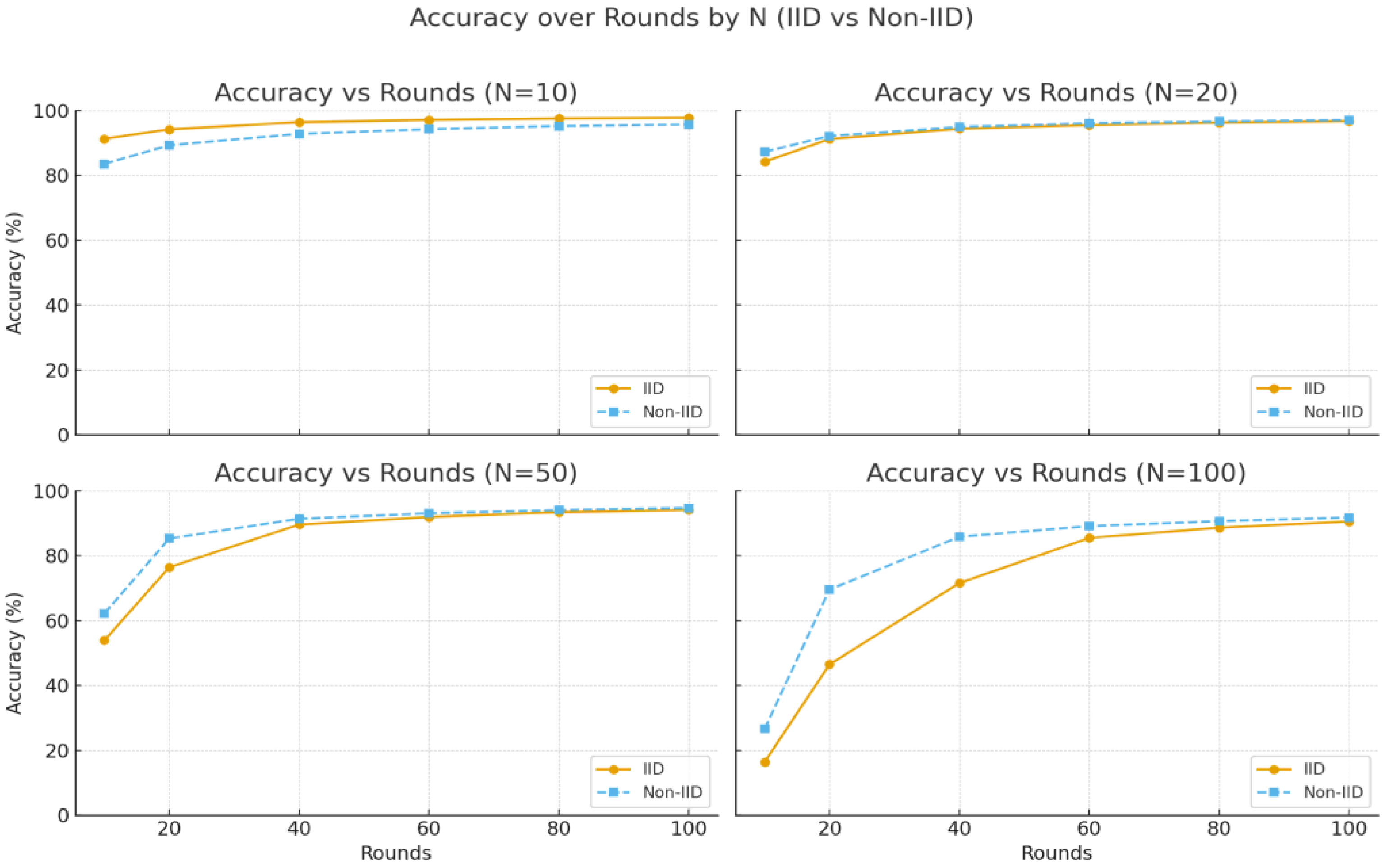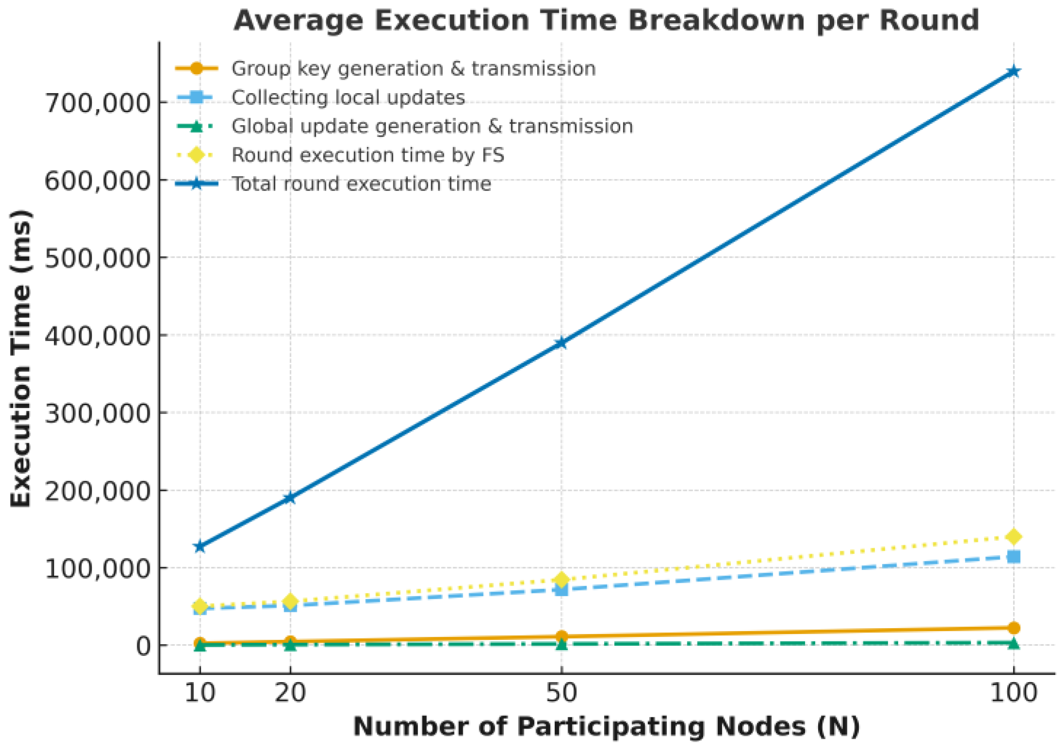 - Robustness against dropouts: The proposed scheme preserves both confidentiality and verifiability even when some nodes drop out or submit delayed updates.