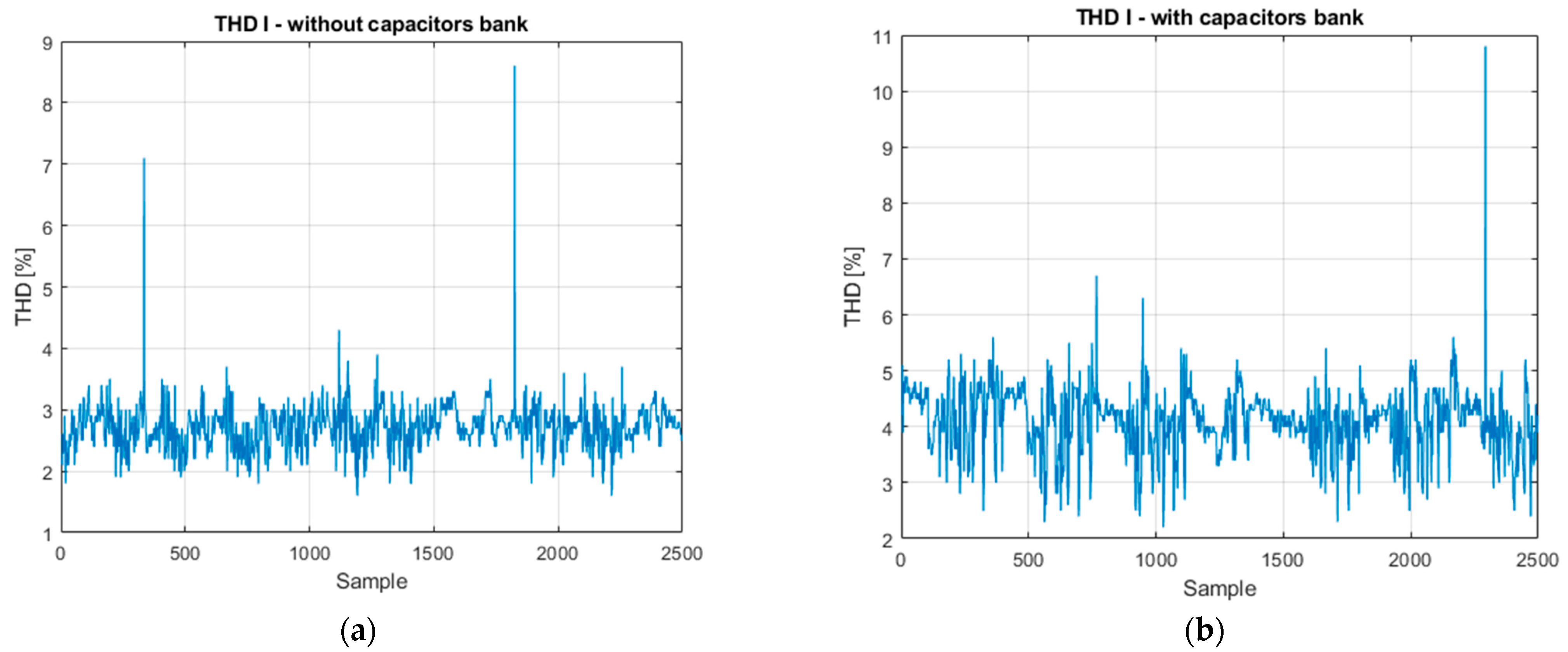The experimental data used for the model development included numerous sequences with sudden and repetitive variations of current, THD, and active/reactive power, which show frequent transient conditions. These data characterize dynamic regimes—with current peaks exceeding 650 A and THD increases of up to 7–8.5%—and are the real input data that were used by the neural network architectures, and thus they were able to learn from real operating fluctuations. The proposed CNN-GRU-LSTM hybrid architecture efficiently learned both short-term transient characteristics and long-term temporal dependencies, which makes it suitable for modeling the nonlinear behavior of THD under such variable load conditions. Although the model does not explicitly classify the operating regimes, it implicitly learns their patterns from the training data. Through experiments performed in both compensated and uncompensated regimes, the network correctly identified the correlations between power variations and distortion peaks. This confirms the model’s ability to adapt to real industrial operating conditions and to provide a good and stable forecast of harmonic distortion during frequent load transitions.