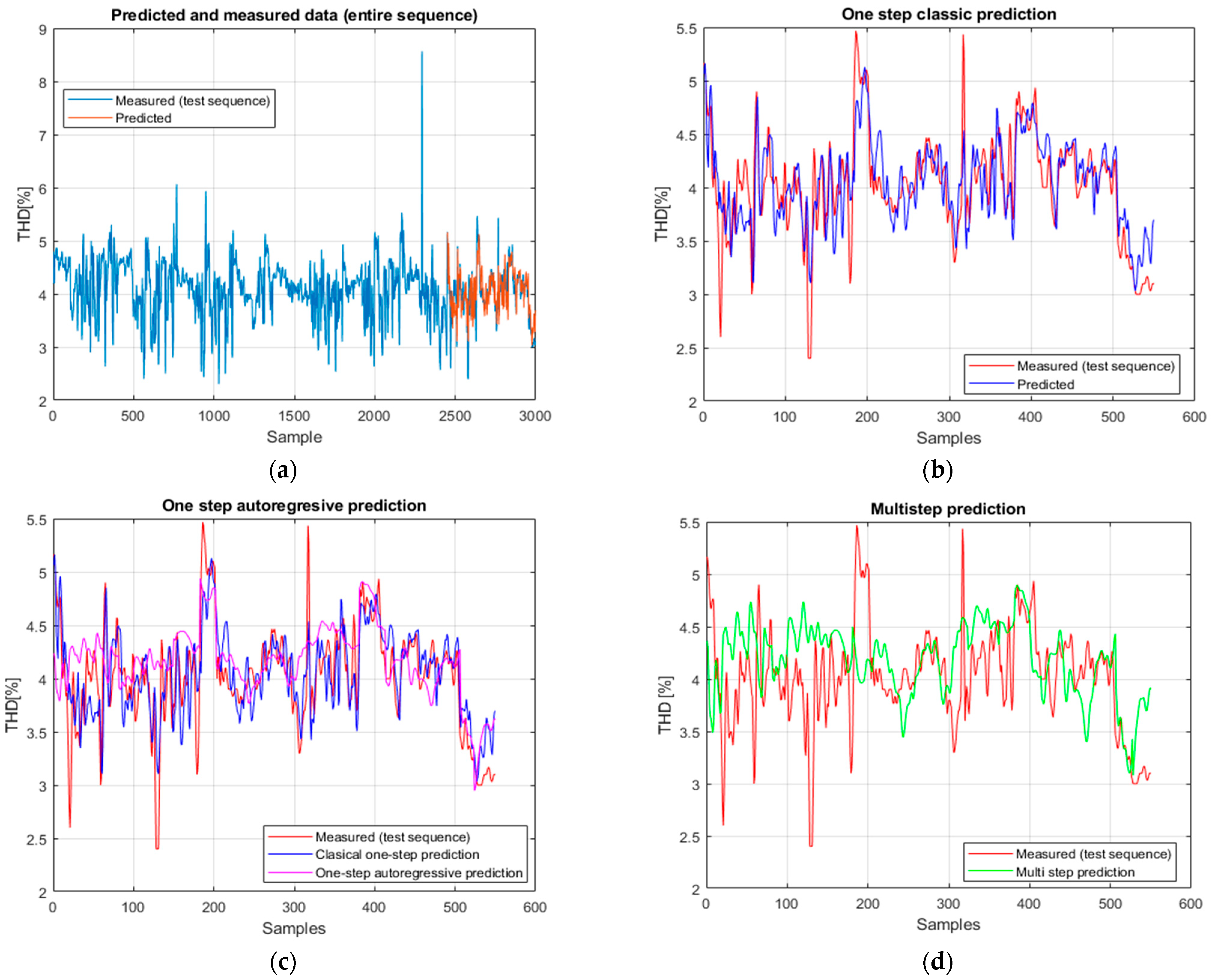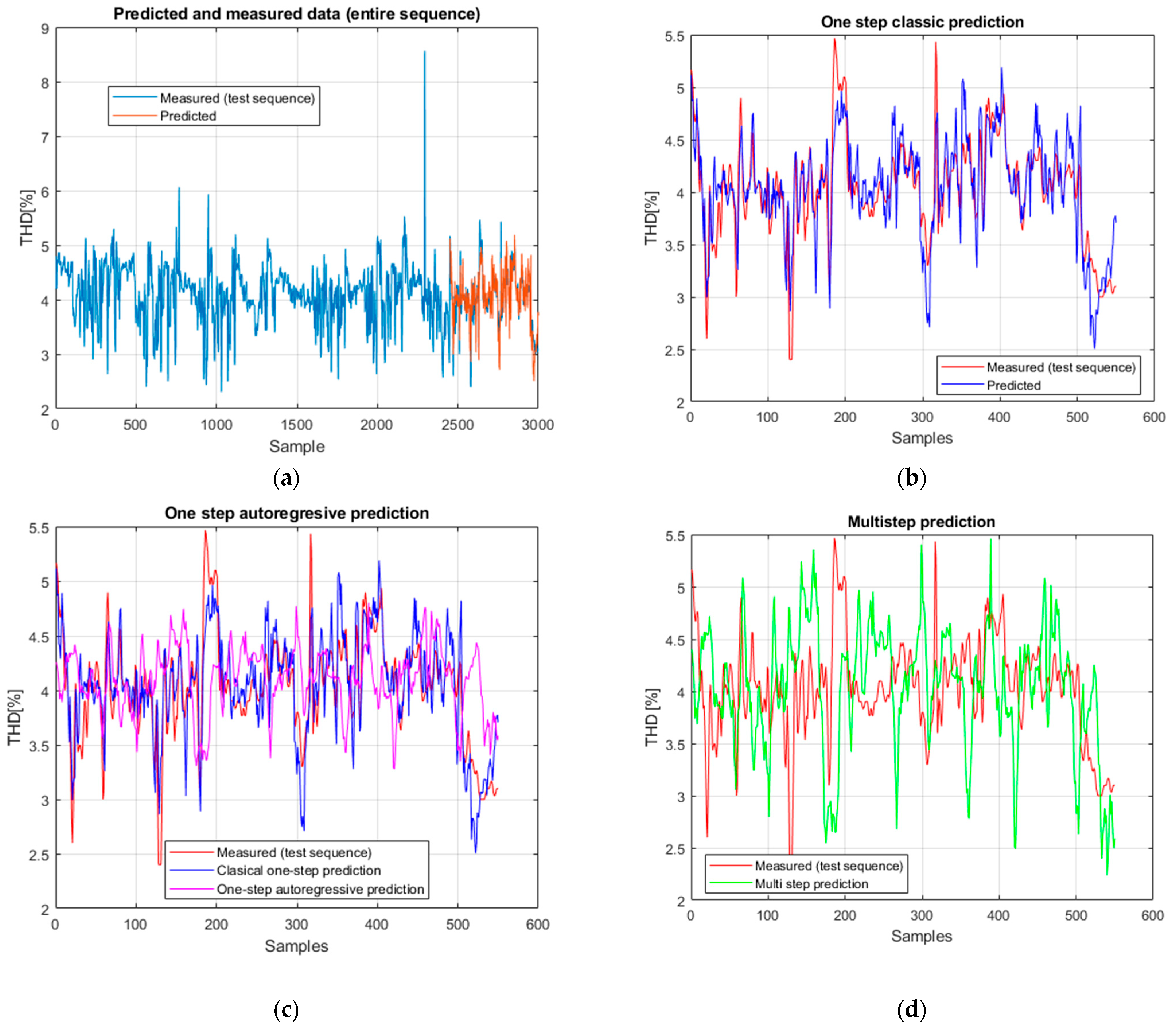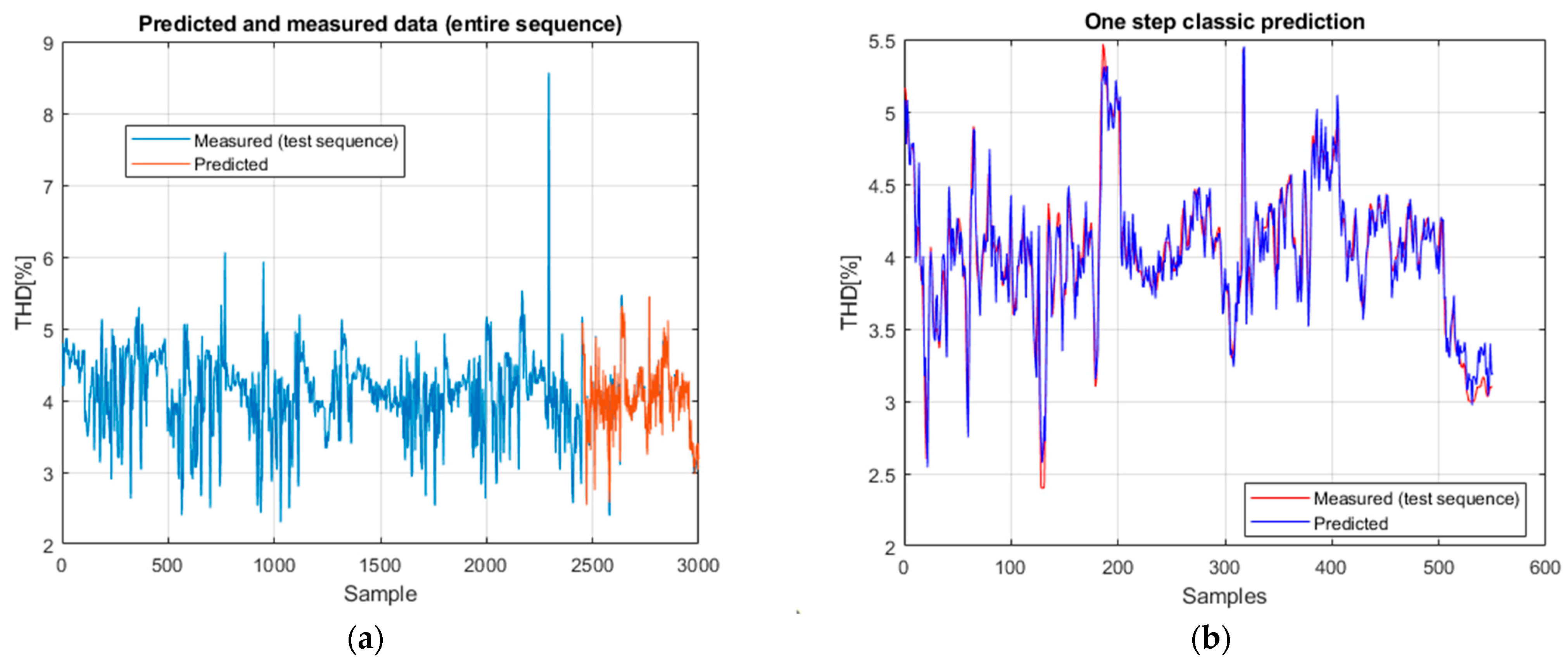 Of the measured data set, 75% was used for training and 25% for testing, so the models were evaluated on data sequences not used for training. Given the sequential nature of the THD time series data, k-fold randomized cross-validation was not appropriate, as it would disrupt the temporal dependencies of the signals.