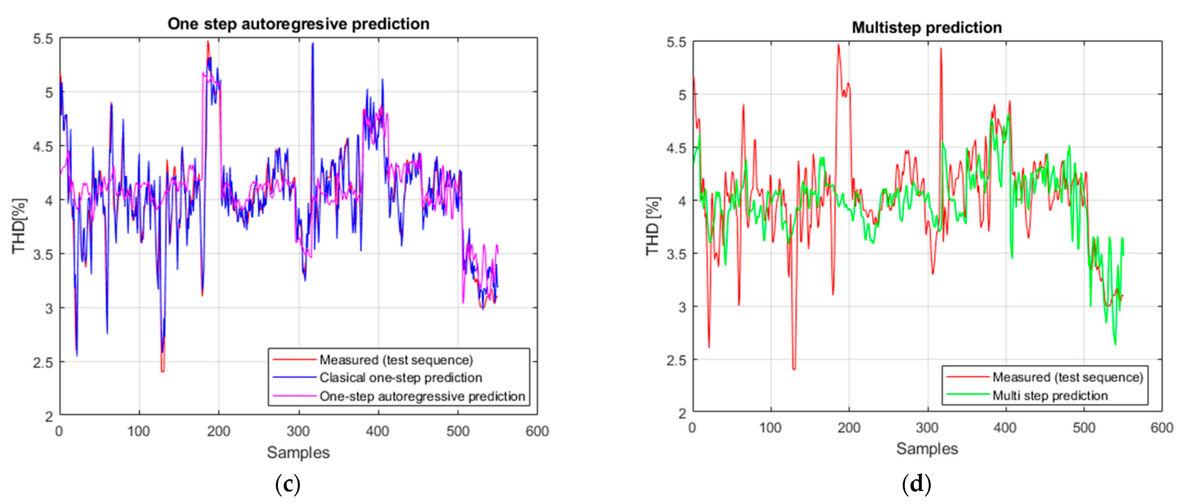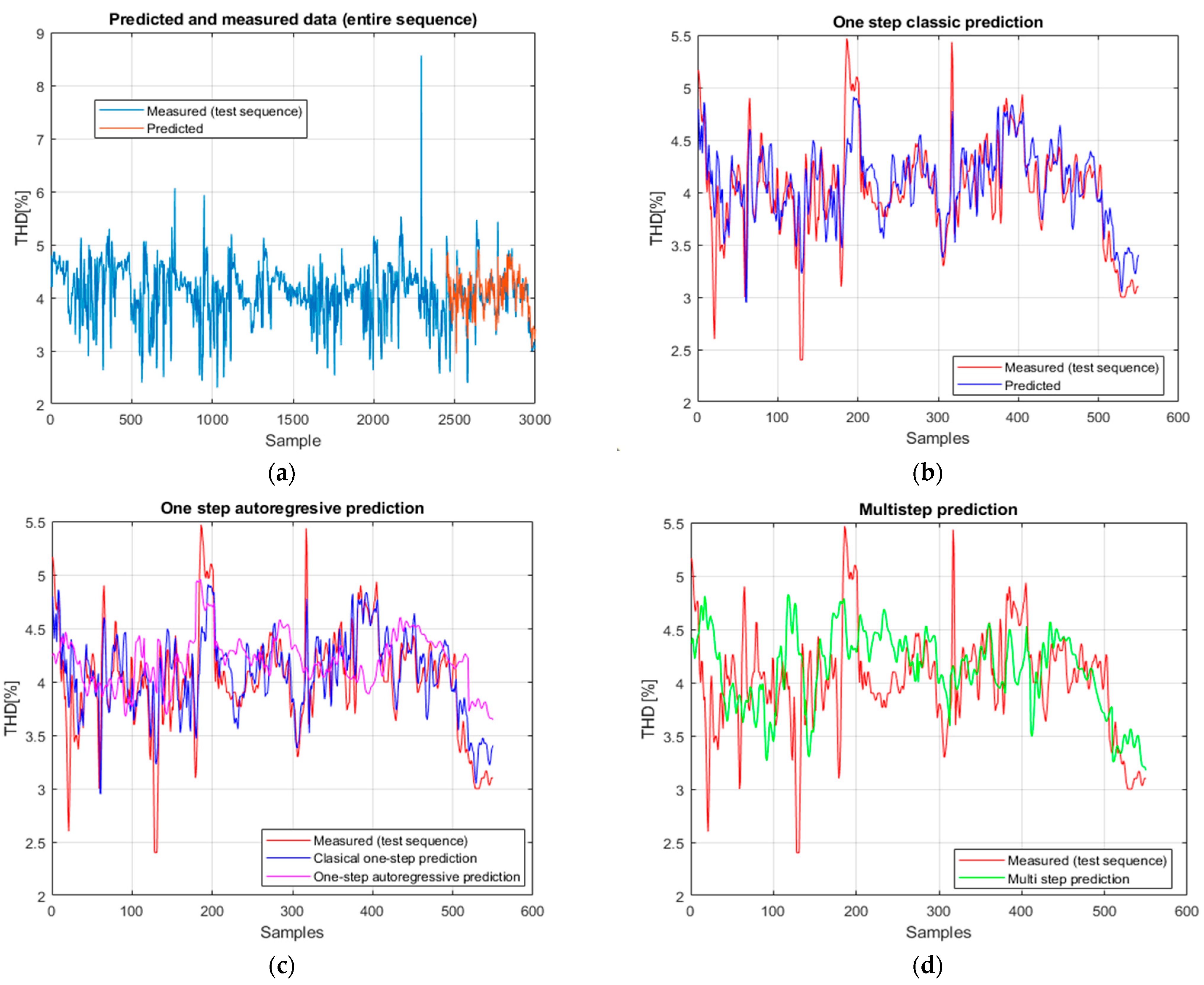 This paper presented a comprehensive analysis of total harmonic distortion (THD) prediction using various neural network architectures, including feedforward networks, recurrent architectures (RNN, GRU, LSTM, BiLSTM), convolutional models (CNN), attention-based variants, and hybrid methods that combine CNN and recurrent units. The study systematically evaluated these models’ performance using three prediction methods: classical prediction on test data, autoregressive one-step prediction, and multi-step prediction.