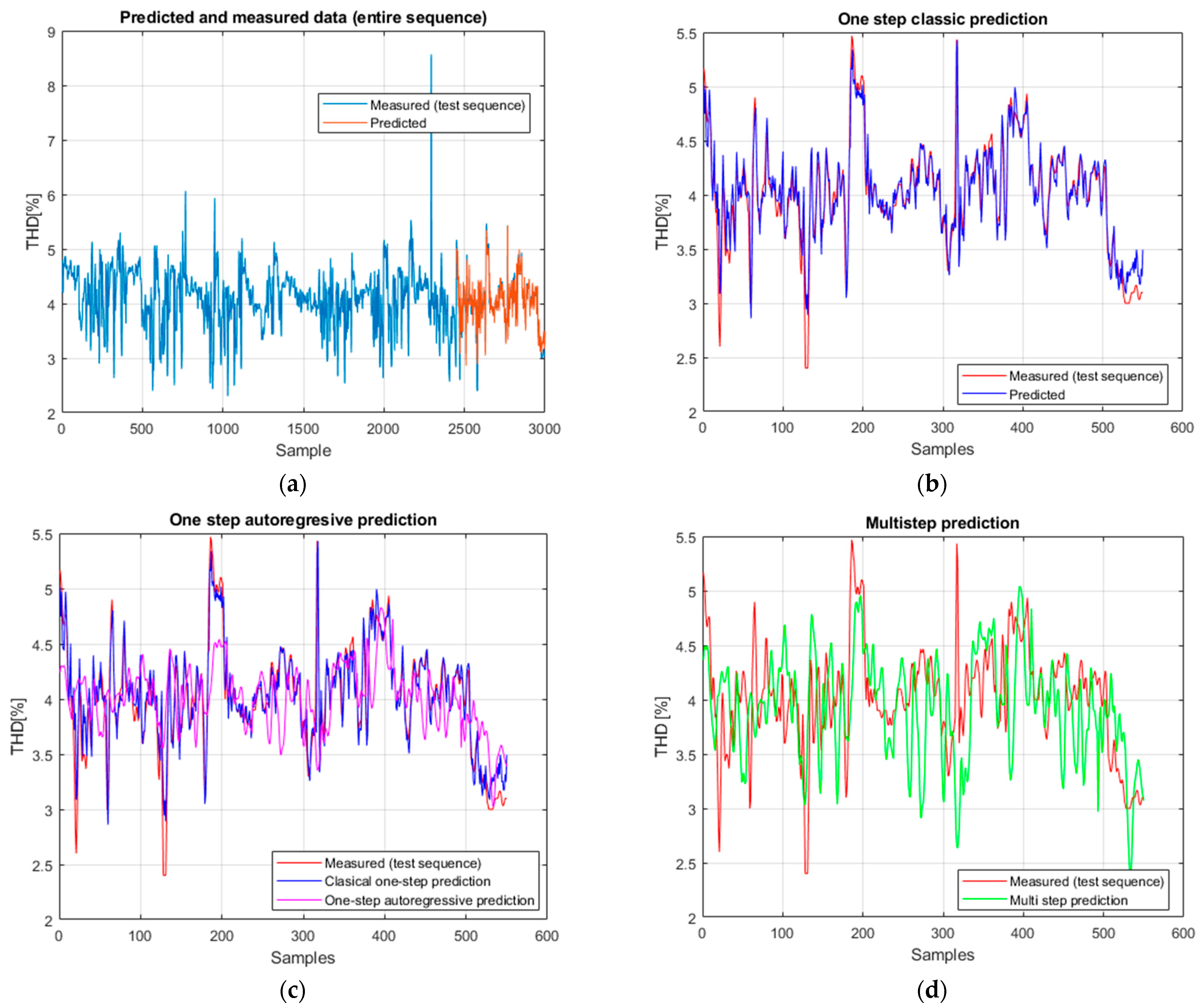 In this article, all neural network models employed—from simple feedforward networks (FNN) to recurrent networks (LSTM, GRU, BiLSTM) and hybrid networks (CNN-LSTM, GRU-LSTM)—were evaluated using three basic prediction methodologies. The first method, single-step parallel prediction, involves estimating each future step using just real data as input, resulting in an optimistic estimate of the model’s performance. The single-step autoregressive prediction method uses previously predicted values as input for subsequent estimates, replicating a realistic scenario where the model must self-feed its input sequence. The third method, multi-step horizon prediction, involves creating the complete future sequence (e.g., 10 or more steps) from only a window of known data, with no access to intermediate real values. This approach has significance for validating the robustness of the model in short- and medium-term forecasting scenarios, especially in situations where real data are not available in real time. The systematic use of these three methodologies enabled a rigorous comparative investigation of each model’s capacity to learn the temporal structure of THD signals.