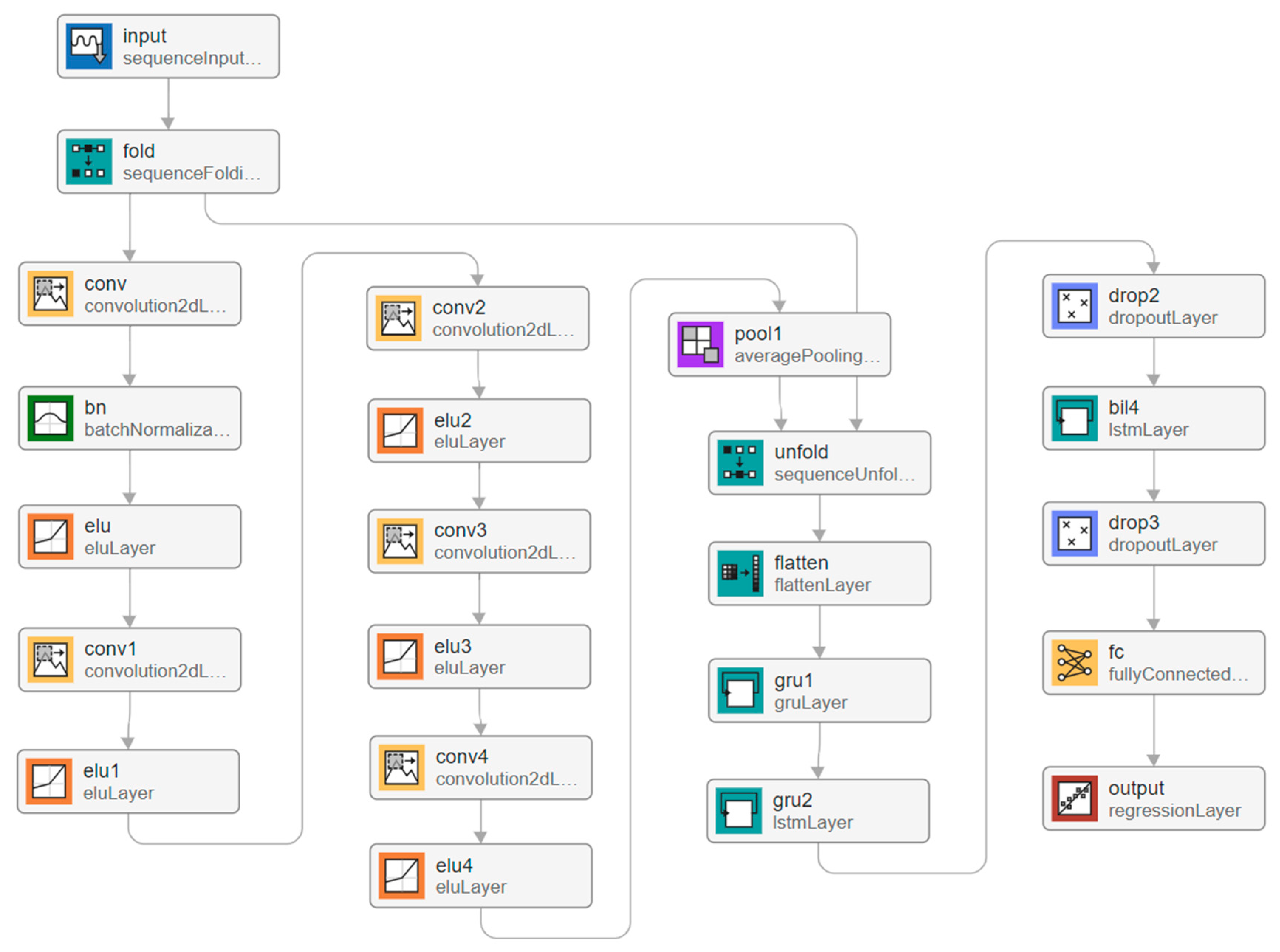Figure 13. It integrates convolutional and recurrent components to capture both local and long-term temporal dependencies in the THD signal. The network includes four convolutional layers (3 × 3 kernels, stride = 1, ELU activation, and batch normalization), followed by an average pooling layer and a flattening operation. The extracted features are processed by a GRU layer (100 units) and an LSTM layer (100 units) in sequence, with dropout regularization (rate = 0.2) between layers. A fully connected regression output layer completes the model.
