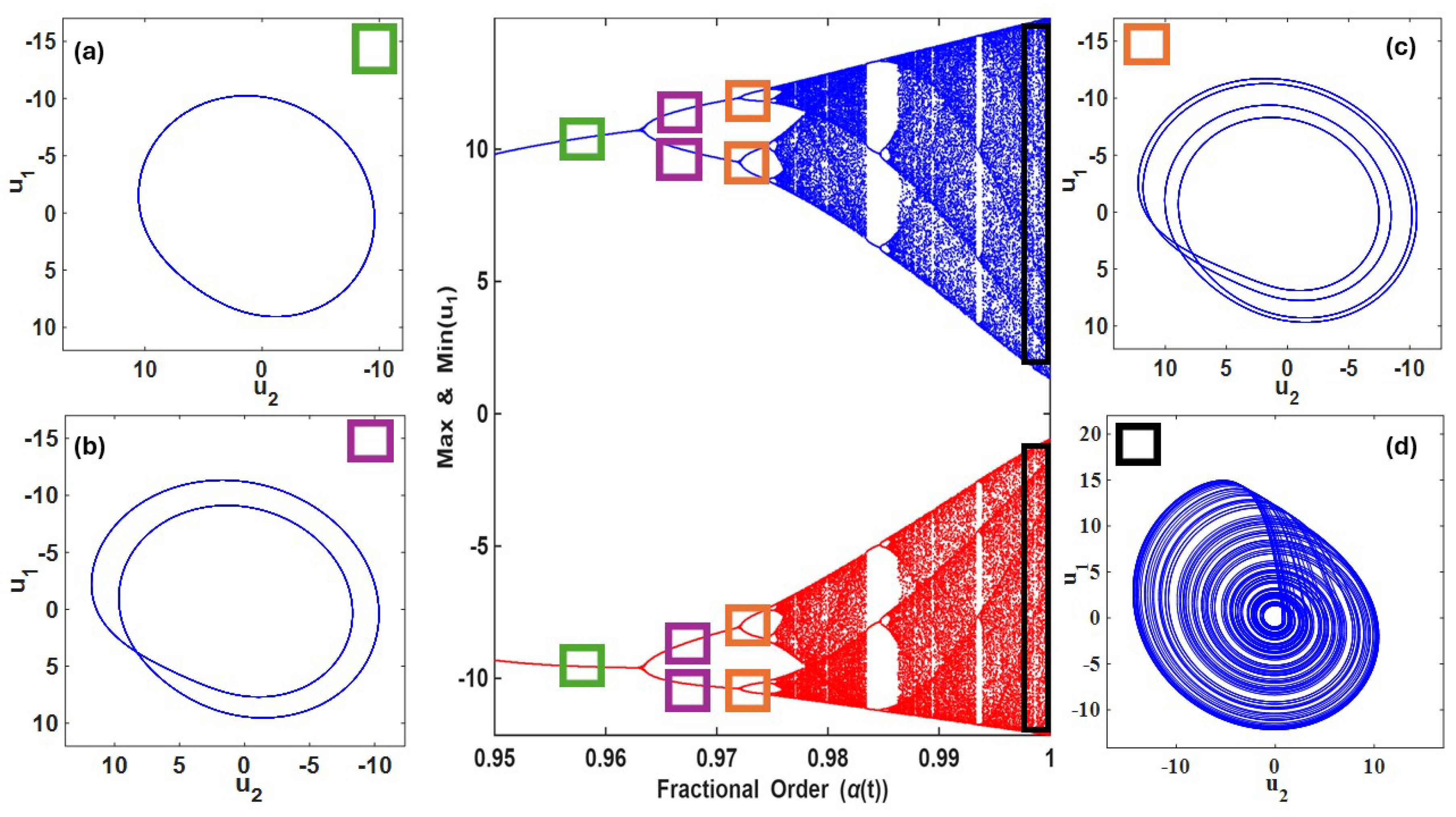 | Response to the initial condition (at ) | The initial sensitivity is consistent across all three selections, as the short-term departure from the starting state is of equal size. | Same thing; small differences show up at , which is when the local fractional-order values are different. | Mid-time behavior () |