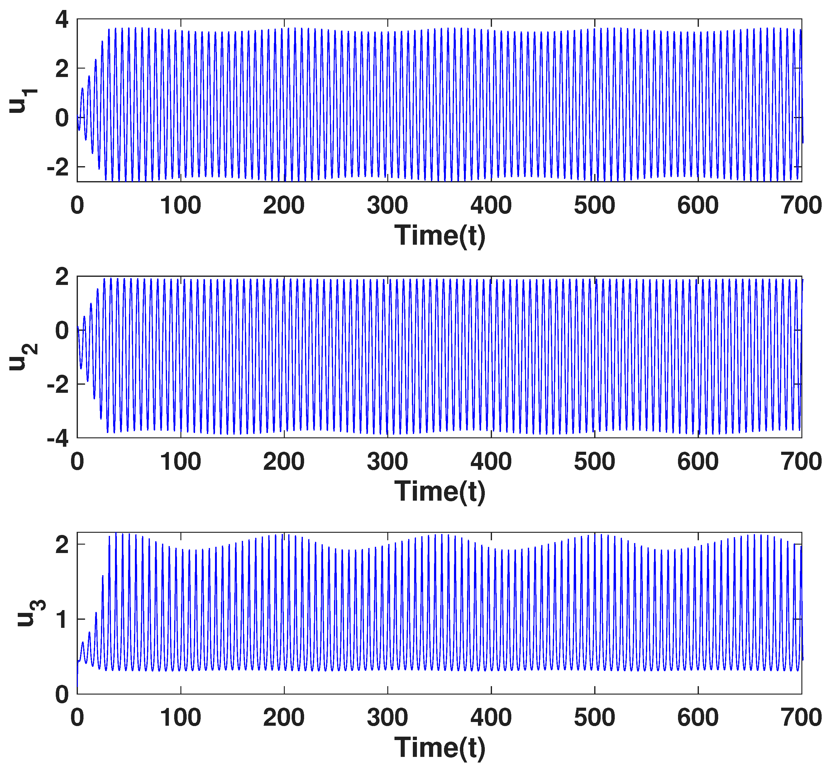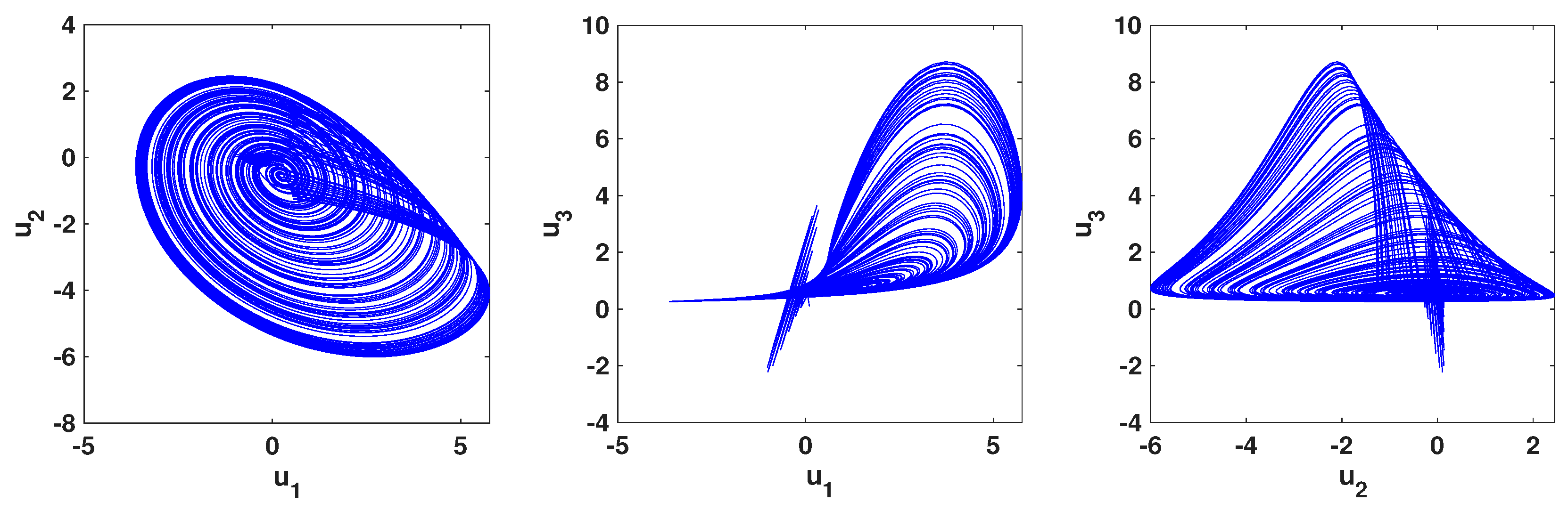 - Sulaiman, I.M.; Owoyemi, A.E.; Nawi, M.A.A.; Muhammad, S.S.; Muhammad, U.; Jameel, A.F.; Nawawi, M.K.M. Stability and Bifurcation Analysis of Rössler System in Fractional Order. In Proceedings of the Advances in Intelligent Manufacturing and Mechatronics: Selected Articles from the Innovative Manufacturing, Mechatronics & Materials Forum (iM3F 2022), Pahang, Malaysia, 22 March 2023; Springer: Berlin/Heidelberg, Germany, 2023; pp. 239–250. [Google Scholar]