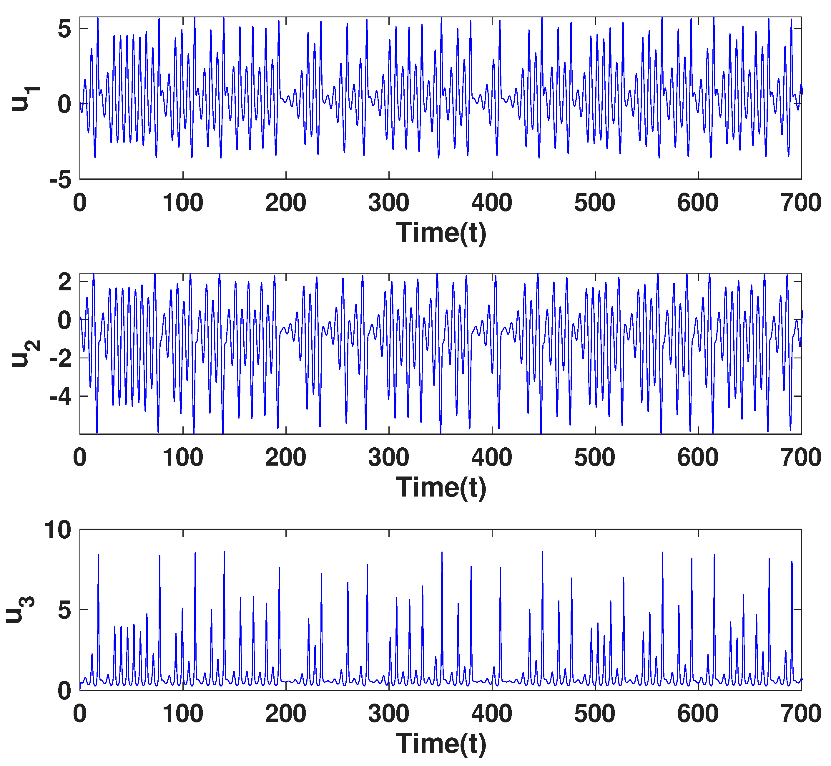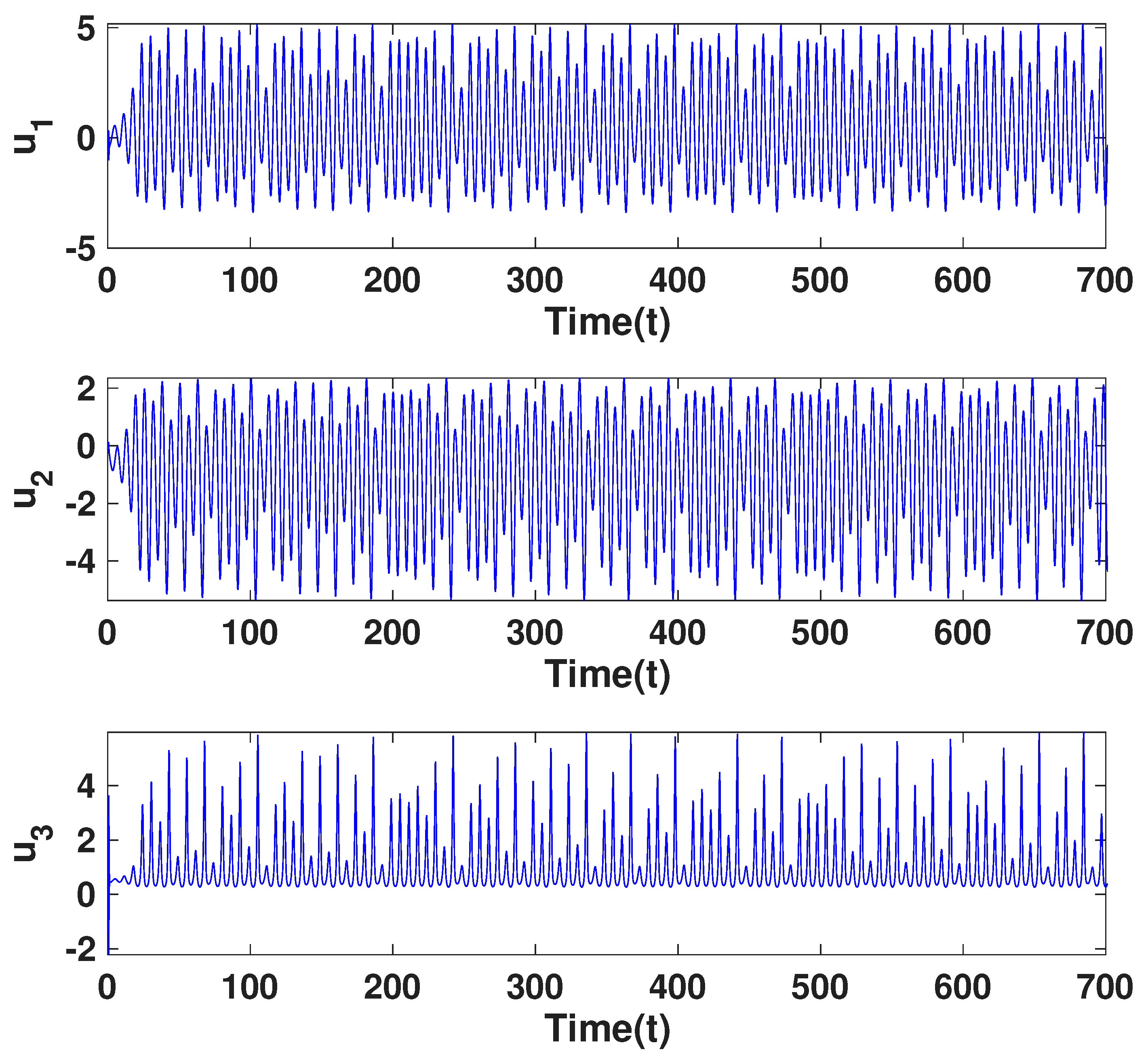 - Wang, J.L.; Wang, Y.L.; Li, X.Y. An efficient numerical simulation of chaos dynamical behaviors for fractional-order Rössler chaotic systems with Caputo fractional derivative. J. Low Freq. Noise Vib. Act. Control 2024, 43, 609–616. [Google Scholar] [CrossRef]