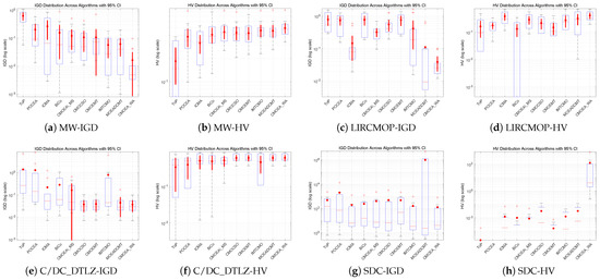 CMOEA-WA also exhibits excellent convergence robustness and solution set distribution stability. The narrow confidence intervals across subplots indicate minimal performance fluctuations over multiple independent runs, demonstrating the effectiveness of the weighted archiving mechanism in balancing convergence speed and population diversity. This mechanism prevents the algorithm from becoming trapped in local optima, enabling it to consistently produce high-quality and uniformly distributed Pareto-approximate solutions across different problem types and scales, such as MW, SDC, and C/DC_DTLZ.