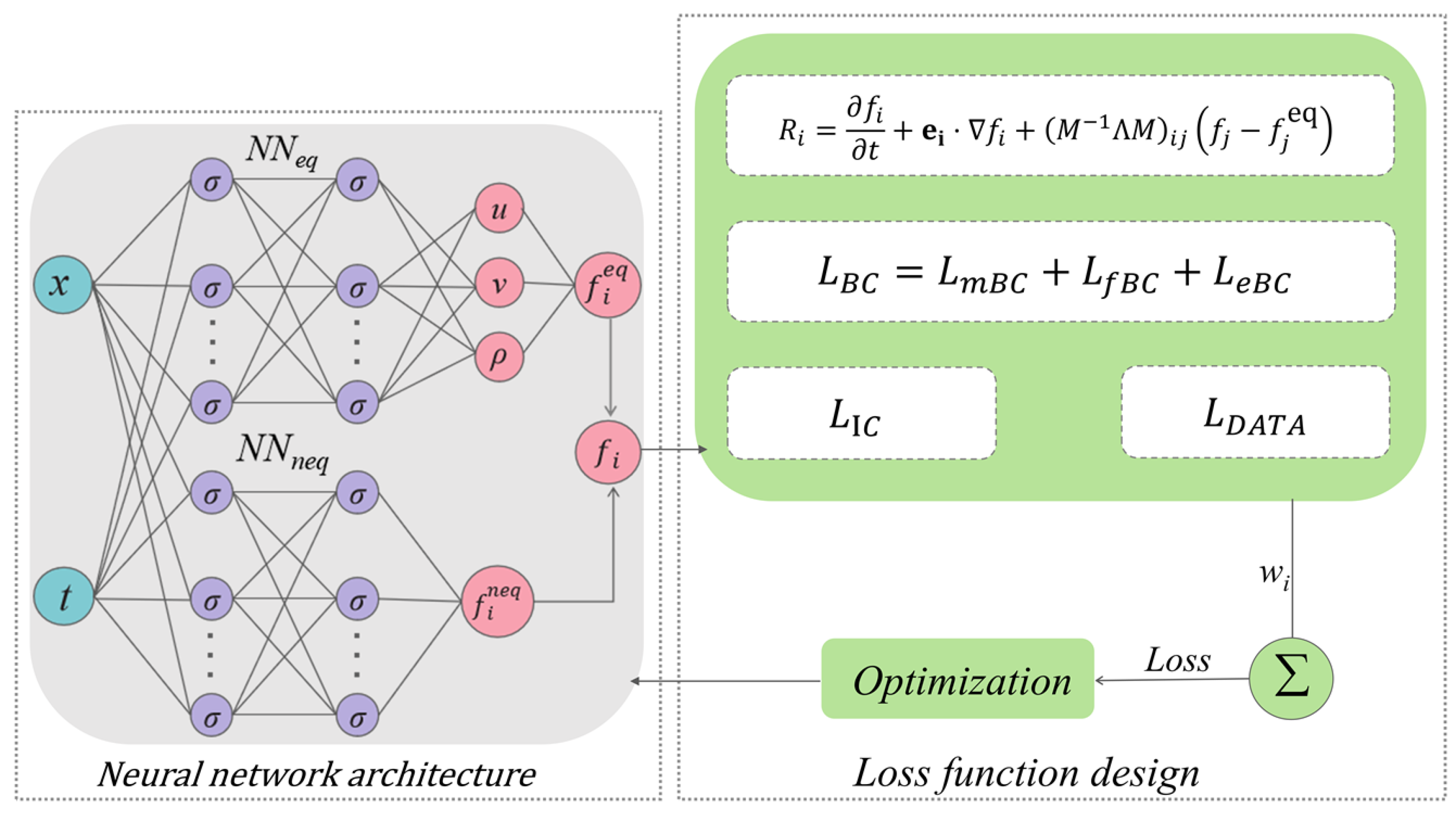 18]. The LBE models the mesoscopic evolution of particle distributions through collision and streaming processes, and offers a solid theoretical basis for complex flow simulations. Based on this foundation, several researchers have explored coupling the LBM with physics-informed neural networks by replacing macroscopic PDEs such as the Navier–Stokes (N–S) equations with the LBE, thereby embedding mesoscopic kinetic physics directly into the learning process [