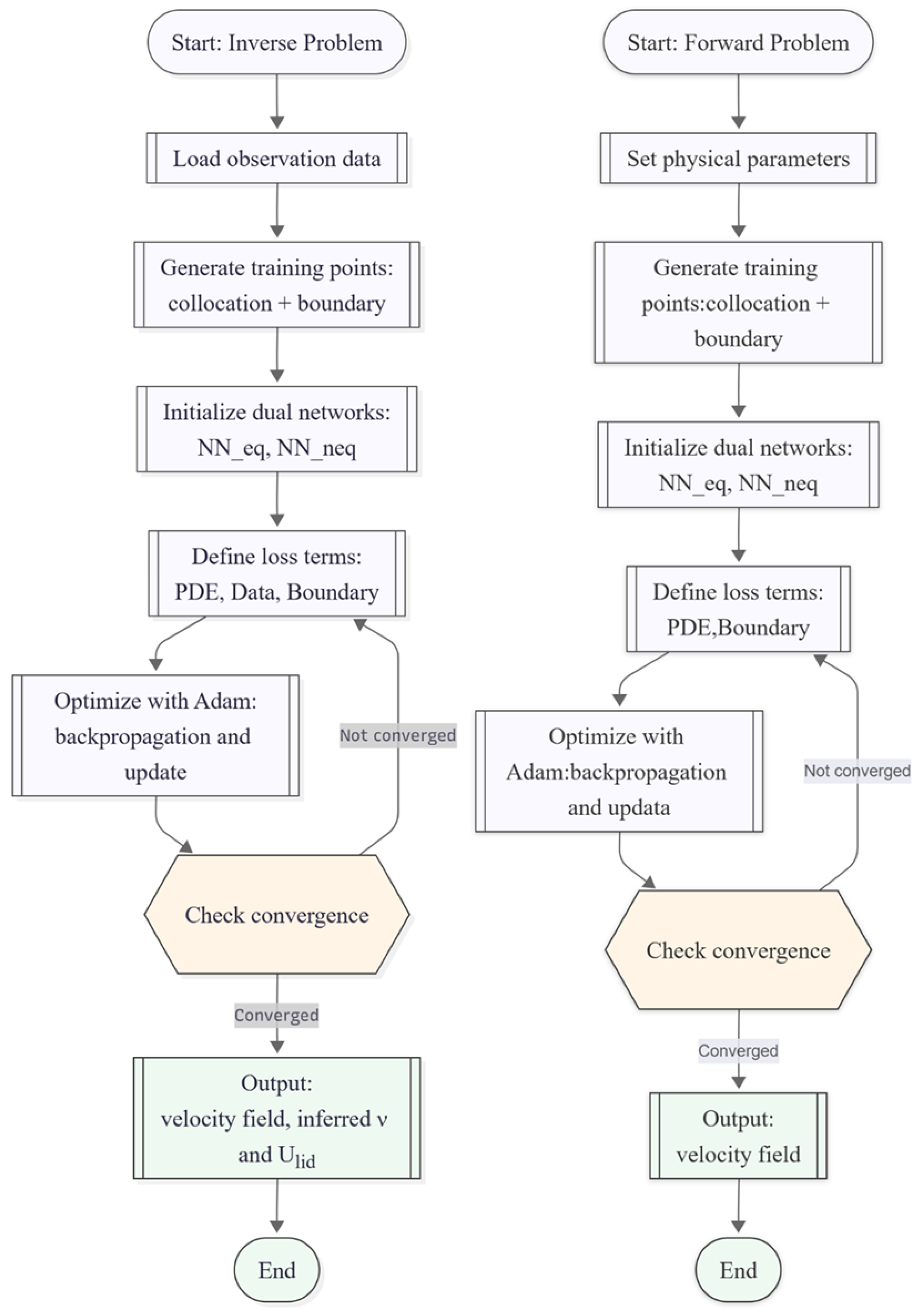 The complete training workflow, including data preparation, dual-network initialization, loss construction, and iterative optimization with the Adam optimizer, is illustrated in